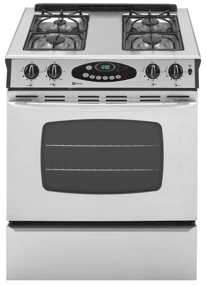 Get the built-in look you want with the cooking power you need. This 30-inch self-cleaning gas range features the Precision Cooking system to provide dependable, even cooking throughout the oven. And with no backsplash, it has a smooth, built-in look that won't cover up your decorative kitchen walls. Plus, the delay start oven can begin dinner before you get home. The Power Center includes four burners: one 5,000 BTU burner with 600 BTU simmer setting, two 9,200 BTU burners, and one 12,000 BTU Power Cook burner for your largest cooking jobs.