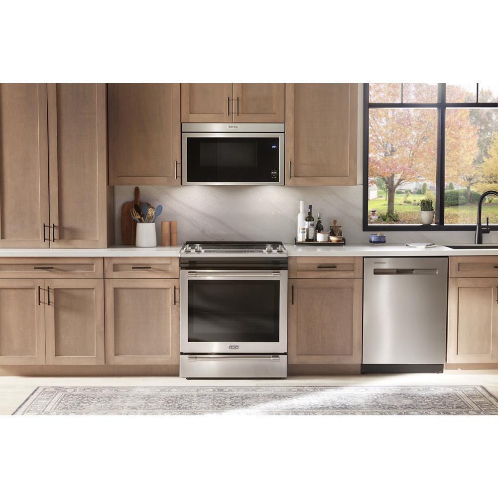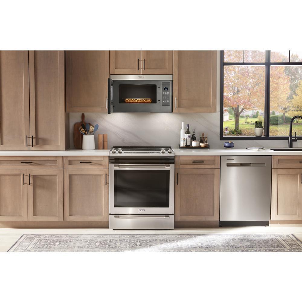 The Maytag® Over-the-Range Flush* Built-In Microwave fits in with your kitchen but stands out with its features. This 1.1 cu. ft. microwave without turntable gives you space for more cooking and quick cleanup so you can spend less time in the kitchen.