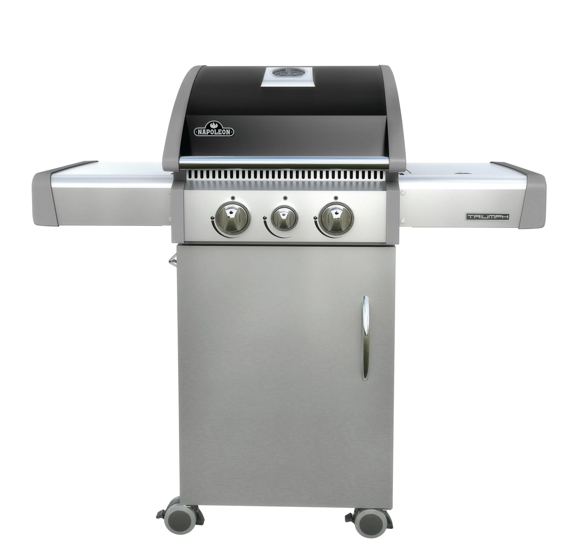 Napoleon's Triumph 325 Gas Grill provides a top notch grilling experience in a small space grill. Three burners fill this grill, with 35,500 BTU's of power. Convenient locking casters and easy to use folding side shelves allow you to save space by tucking this grill away when you're not using it.