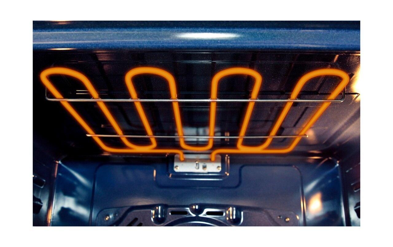 Heating element highlighted for illustration purposes. Easy CleanupThe 6-pass hidden bake element and sculpted floor of the modern, cobalt blue porcelain interior makes cleanup a breeze.