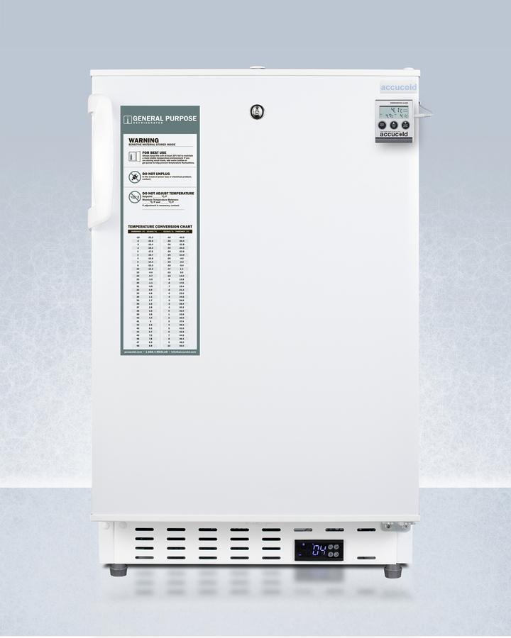 Accucold offers a quality selection of 20" wide built-in undercounter all-refrigerators designed for installation under lower ADA compliant counters and for the storage of vaccines and medical supplies. The ADA404REFAL is sized at 32" high to fit under lower counters complying with ADA guidelines for accessibility. The fully finished textured white cabinet allows freestanding use, while the front-breathing system means this unit can be built-in with minimum clearance. The door is 3" thick for efficient insulation, with a top-mounted lock for added security and convenient access. A digital thermostat, located in the kickplate, makes for easy temperature management with a readout in Fahrenheit or Celsius. This unit comes with a hospital grade cord with a green dot plug for added safety in high-traffic areas. Powerful magnetic gaskets ensure a tight seal. This model comes with a right-hand door swing. (Note: For a left-hand door swing, please select option 'LHD' when ordering. The door is not user reversible.) The ADA404REFAL is designed to operate between +2(degree)C and +8(degree)C as recommended for the storage of vaccines, select pharmaceuticals, and other medical supplies. For optimum temperature management, a pre-installed thermometer is included that provides an external readout of the current and high/low temperatures to the nearest tenth of a degree (as recommended by the CDC, VFC and VFA). The display is switchable between Celsius or Fahrenheit at the touch of a button. The thermometer includes an audible alarm to warn users if the interior has gone out of the programmed temperature range. The buffered temperature probe is encased in a glycol-filed bottle and secured on the left wall of the interior cabinet to best simulate the temperature of other stored contents, resulting in the utmost accuracy for temperature reporting. (Note: for this unit with a NIST calibrated thermometer, see the ADA404REFCAL.) Inside, an LED light located on the front left side of the unit attractively illuminates the interior when the door opens. Automatic defrost operation ensures minimal user maintenance, with an internal fan to help promote even cooling throughout the 3.32 cu. ft. interior. Adjustable wire shelves allow you to rearrange the interior to best suit your storage needs. As recommended by the CDC, this unit has a flat door liner to ensure users don't store sensitive contents on the door. The open door alarm sounds if the door is ajar beyond one minute for added peace-of-mind but can be disabled depending on your needs. Sized at just under 20" wide, the ADA404REAL is the ideal storage solution for doctors' offices, clinics, and similar facilities. NOTE: Accucold refrigerators are purpose-built to the support meeting the current CDC (Centers for Disease Control) guidelines for the storage of vaccines. At this time, Accucold refrigerators have not been evaluated to the new NSF 456 standard. As referenced in the current Vaccine Storage and Handling Toolkit, these units incorporate microprocessor controls and forced air circulation for stable operation between 2 and 8 C. For additional temperature assurance, the CDC recommends a calibrated digital data logger (DDL), which can be added with the factory-installed option DL2B or addition of the DL2BKit accessory.