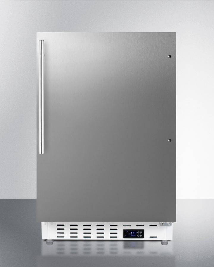 Summit Appliance offers a quality selection of 21" wide built-in undercounter all-freezers designed for installation under lower ADA compliant counters, with advanced features for user convenience. The ALFZ36CSSHV is sized at 32" high to fit under lower counters complying with ADA guidelines for accessibility. The fully finished stainless steel cabinet allows freestanding use, while the front-breathing system means this unit can be built-in with minimum clearance. The stainless steel, user-reversible door is 3" thick for efficient insulation, with a sleek vertical handle with a thin 14mm diameter, a popular style that matches many common cabinet handles. This unit comes with a right angle cord to allow for easier placement without added depth. A digital thermostat, located in the kickplate, makes for easy temperature management with a readout in Fahrenheit or Celsius. Inside, the ALFZ36CSSHV features an all-white interior for easy cleaning and viewing of contents. Static manual defrost operation provides efficient cooling inside the 2.68 cu.ft. interior. Three adjustable wire shelves offer optimal storage options for large and small items, while three removable door racks accommodate additional storage as needed. The user-set high and low temperature alarms provide added security should the temperature go beyond the setpoint, while the open door alarm sounds if the door is ajar over one minute for added peace-of-mind. These alarms can be disabled depending on your needs. Sized at just 21" wide, the ALFZ36CSSHV is the perfect addition for space-challenged spaces seeking dependable freezer options in a durable design. For a complete set, pair this unit with the matching ALR46WCSSHV all-refrigerator. Additional choices are available in stainless steel and panel-ready exterior finishes.