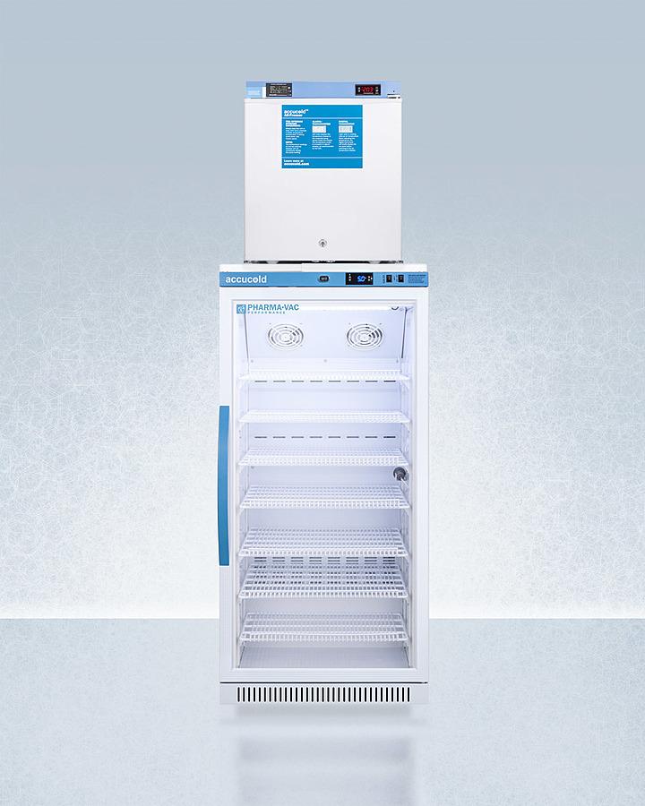 Accucold offers innovative solutions to vaccine storage with stackable purpose-built refrigerator-freezer combinations design to support meeting CDC/VFC/VFA guidelines, with a powder-coated silver ion handle that helps prevent germ spread. Sized just under 24" wide, the ARG8PV-FS24LSTACKMED2 combines the 8 cu.ft. ARG8PV auto defrost all-refrigerator with the compact FS24LMED2 all-freezer into one slim footprint using Accucold's StackRack. This ships in three boxes and requires some minor assembly upon delivery. Refrigerator ARG8PV is part of Accucold's Pharma-Vac Performance Series, designed to meet the demanding needs of vaccine storage. It utilizes a microprocessor temperature controller with an adjustable control range from +2 to +8 C. The buffered temperature probe is encased in a glycol-filled bottle to better simulate temperature of the stored product, with an additional sensor that reads air temperature to ensure superior temperature control. The current and min/max temperature display is viewable in Celsius or Fahrenheit to the nearest tenth of a degree. The audible and visual temperature alarm sounds if the unit's interior goes out of range. Additional alarms include a power failure alert, door open alarm, and sensor failure alarm. This unit is equipped with remote alarm contacts in the rear and a 1/2" probe port on the right side to accept additional monitoring devices. A hospital grade cord with 'green dot' plug is also included for added safety in high traffic areas. Inside, the ARG8PV utilizes adjustable cycle defrost operation to avoid temperature spikes. Optimized forced air cooling with two internal fans ensures excellent temperature stability and uniformity with rapid recovery after door openings. The adjustable plastic-coated wire shelves can be positioned at 1/2" increments to accommodate virtually any sized item. We include seven shelves, more than competitor products providing to maximize interior shelving storage area. This unit includes LED internal lighting with an on/off rocker switch. The interior is constructed from white powder coated metal to ensure added durability and better temperature retention. Designed to be stacked on top of the ARG8PV, the FS24LMED2 freezer utilizes manual defrost operation, with a digital control panel and NIST calibrated thermometer that provides a continuous display of the current and high/low temperature. This unit is also equipped with a temperature alarm and access port to accept additional monitoring equipment. Both units include front-mounted keyed locks and powerful magnetic gaskets to ensure a positive seal. The refrigerator has a self-closing door for added protection in high traffic settings, and comes with a factory-installed antimicrobial handle that is powder-coated with naturally occurring silver ions, which help to reduce the spread of germs, allowing for a safer, cleaner user experience. Additional stacked combinations are available. Browse Accucold's website for more information, or contact our sales team at 718-893-3900 to discuss your equipment needs. NOTE: Accucold refrigerators are purpose-built to the support meeting the current CDC (Centers for Disease Control) guidelines for the storage of vaccines. At this time, Accucold refrigerators have not been evaluated to the new NSF 456 standard. As referenced in the current Vaccine Storage and Handling Toolkit, these units incorporate microprocessor controls and forced air circulation for stable operation between 2 and 8 C. For additional temperature assurance, the CDC recommends a calibrated digital data logger (DDL), which can be added with the factory-installed option DL2B or addition of the DL2BKit accessory.