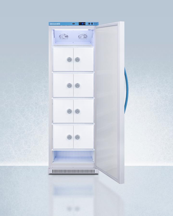 Accucold's Pharma-Vac Performance Series are upright all-refrigerators designed and purpose-built for pharmacy, medication, and vaccine applications to support meeting CDC/VFC/VFA guidelines, with a powder-coated silver ion handle that helps prevent germ spread. The ARS15PVLOCKER is a 15 cu.ft. all-refrigerator with an adjustable control range from +2 to +8 C. The microprocessor temperature controller is externally located to minimize door openings, helping to protect stored contents from ambient temperature. The buffered temperature probe is encased in a glycol-filled bottle to better simulate temperature of the stored product, with an additional sensor that reads air temperature to ensure superior temperature control. The current and min/max temperature display is viewable in Celsius or Fahrenheit to the nearest tenth of a degree. The audible and visual temperature alarm sounds if the unit's interior goes out of range. Additional alarms include a power failure alert, door open alarm, and sensor failure alarm. This unit is equipped with remote alarm contacts in the rear and a 1/2" probe port on the right side to accept additional monitoring devices. A hospital grade cord with 'green dot' plug is also included for added safety in high traffic areas. Inside, the ARS15PVLOCKER has eight lockers, each with a combination lock to ensure appropriate security for storage of vaccines and medicines, which can be reset or overridden as needed with included master keys. The adjustable cycle defrost operation helps to avoid temperature spikes. Optimized forced air cooling with one internal fan ensures excellent temperature stability and uniformity with rapid recovery after door openings. The adjustable plastic-coated wire shelves can be positioned at 1/2" increments to accommodate virtually any sized item. We include seven shelves, more than competitor products providing to maximize interior shelving storage area. This unit includes LED internal lighting with an on/off rocker switch. The interior is constructed from white powder-coated metal to ensure added durability and better temperature retention. The ARS15PVLOCKER comes in a white cabinet finish with a blue accented control panel and user-reversible door. The factory-installed antimicrobial handle is powder-coated with naturally occurring silver ions, which help to reduce the spread of germs, allowing for a safer, cleaner user experience. This model includes a factory-installed lock and ships with two keys for staff use. Powerful magnetic gaskets ensure a positive seal. Designed with hydrocarbon refrigerant, the ARS15PVLOCKER provides an energy-efficient solution to vaccine storage. This unit is Pyxis, Omnicell, and AcuDose RX compatible. Additional sizes, as well as solid door options, are also available. Explore the full Pharma-Vac series at accucold.com/pharmavac. NOTE: Accucold refrigerators are purpose-built to the support meeting the current CDC (Centers for Disease Control) guidelines for the storage of vaccines. Units that end in suffix "456" have been certified to the new NSF 456 standard. As referenced in the current Vaccine Storage and Handling Toolkit, these units incorporate microprocessor controls and forced air circulation for stable operation between 2 and 8 C. For additional temperature assurance, the CDC recommends a calibrated digital data logger (DDL), which can be added with the factory-installed option DL2B or addition of the DL2BKit accessory.