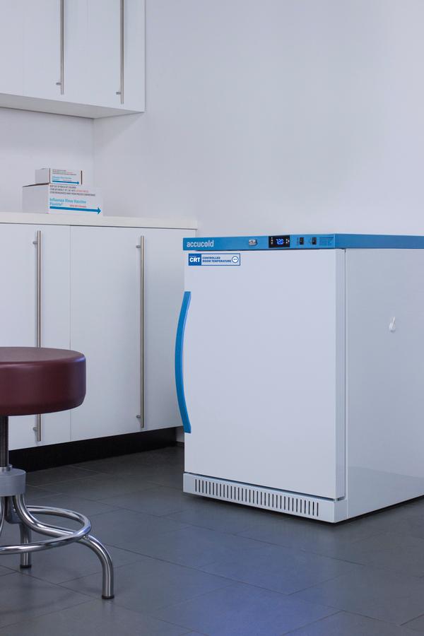 Accucold's Performance Series Controlled Room Temperature Cabinets offer purpose-built storage solutions for medication requiring a stable room temperature environment. The ARS6PV-CRT is a 6 cu.ft. upright unit pre-set to 72 F, with an adjustable range from 68 to 77 F. It is sized at 32.5 inches high for use in most ADA compliant applications. The microprocessor temperature controller is externally located to minimize door openings, helping to protect stored contents from ambient temperature. The buffered temperature probe is encased in a glycol-filled bottle to better simulate temperature of the stored product, with an additional sensor that reads air temperature to ensure superior temperature control. The current and min/max temperature display is viewable in Celsius or Fahrenheit to the nearest tenth of a degree. The audible and visual temperature alarm sounds if the unit's interior goes out of range. Additional alarms include a power failure alert, door open alarm, and sensor failure alarm. This unit is equipped with remote alarm contacts in the rear and a 1/2" probe port on the right side to accept additional monitoring devices. A hospital grade cord with 'green dot' plug is also included for added safety in high traffic areas. Inside, the ARS6PV-CRT utilizes adjustable cycle defrost operation to avoid temperature spikes. Optimized forced air cooling with an internal fan to ensure excellent temperature stability and uniformity with rapid recovery after door openings. The adjustable plastic-coated wire shelves can be positioned at 1/2" increments to accommodate virtually any sized item. This unit includes LED internal lighting with an on/off rocker switch. The interior is constructed from white powder coated metal to ensure added durability and better temperature retention. The ARS6PV-CRT comes in a white cabinet finish with a blue accented control panel. The factory-installed antimicrobial handle is powder-coated with naturally occurring silver ions, which help to reduce the spread of germs, allowing for a safer, cleaner user experience. The user-reversible door ships with a right hand swing and self-closing function. This model includes a factory-installed lock and ships with two keys for staff use. Powerful magnetic gaskets ensure a positive seal. Designed with hydrocarbon refrigerant, the ARS6PV-CRT provides an energy efficient solution to stabilized room temperature storage, even when ambient temperatures can reach temperatures as cold as 68 F or warm as 86 F. This unit is Pyxis, Omnicell, and AcuDose RX compatible. Additional sizes, as well as glass door options, are also available.
