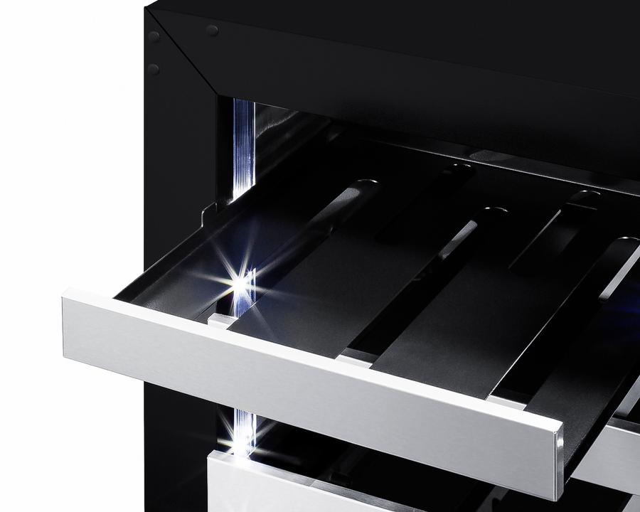 Summit's shallow depth series of built-in undercounter refrigeration brings full functionality to kitchen islands, wet bars, and other settings with space limitations. Model ASDW1522PNRLHD is a 15" wide single zone wine cellar sized under 18" deep. It comes in a 32" height to fit under lower ADA compliant counters, with adjustable legs and a sliding kickplate cover that also allows you to raise the overall height up to 34" to fit standard counter spaces. The front-breathing system allows built-in installation, while the fully finished black cabinet also allows freestanding use. This unit features our European style fully articulating hinge, allowing for easy installation of custom door trim panels to match your cabinetry. The sealed rear and right angle cord ensure a better fit. The door ships with a left hand door swing and includes a front lock to protect your collection. Inside, the ASDW1522PNRLHD features stainless steel construction for improved durability and sanitation. White LED lighting located in the side walls provides elegant display conditions, with dimmable levels that let you create the perfect presentation. The digital control panel lets you adjust the temperature between 41 and 64 F to accommodate red, white, or sparkling wine. Store bottles on the removable steel shelves complete with stainless steel front trim. Fan-forced cooling ensures even temperature distribution and fast temperature recovery. Additional features include an open door alarm, high temperature alarm, and Sabbath mode setting that lets you disable some of the electrical elements during periods of observance. The ASDW1522PNRLHD is ETL-S listed to NSF-7 commercial standards but can also be used in the home. With its deluxe style, user-friendly features, and uniquely shallow depth, this unit offers premium value for a variety of settings. Create a matching set by pairing this with our ASDG1521PNR beverage center. Additional 18" deep choices are available in 15", 19", and 24" widths, including outdoor refrigerators, refrigerator drawers, and more. NOTE: The interior can store up to 18 Bordeaux-style bottles. Due to the shallow depth of this unit, we recommend loading the bottles with the cork facing the rear for a better fit. Wider Burgundy bottles will fit on most shelves, but as these may vary more in size, loading capacity will ultimately depend on your specific bottle. You may also remove shelves to accommodate thicker bottles, such as champagne and sparkling wine.
