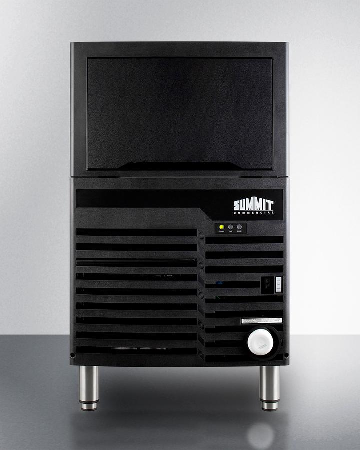 Summit Commercial brings powerful performance and user-friendly convenience in an under the counter design with the BIM100 commercially approved icemaker. Made for Summit in South Korea, the BIM100 is ETL-S listed to NSF-12 standards for use in commercial applications. This unit features a fully finished stainless steel cabinet and jet black front with a slide-up lid. It can be built-in under counters or used freestanding, with a front-breathing air-cooled system to prevent overheating. The BIM100 produces up to 100 lbs. of clear dice style ice cubes per day. The interior can store up to 27 lbs. to help meet the needs of high traffic commercial environments, with an automatic sensor to prevent overproduction. This unit has a 30" high cabinet and ships with a 4-piece set of 4.5" high commercial legs to raise the unit off the floor to a more standard counter height. All controls are conveniently located in front, with a removable mesh filter to make it easy to remove dust buildup from affecting the condenser. We also include an ice scoop for serving convenience. The BIM100 is designed to operate quietly. It comes equipped with an internal wash setting for simple maintenance, and a 7.5" long power cord for flexible placement. This unit has a sealed back in stainless steel for added space savings and easier cleanup. It utilizes a gravity drain system and requires professional installation (drain size: 3/4"; water supply/inlet size: 3/8"). The BIM100 ships with an included water purification filter to ensure better tasting ice. This filter is required in order to operate the unit and will need to be replaced every six months (timing may vary based on the quality of your water). To order a replacement set, visit summitappliance.com/filter100. With its high capacity output and slim-fitting design, the BIM100 is ideal for bars, restaurants, cafes, office spaces, and similar environments seeking a professional icemaker in a durable design.