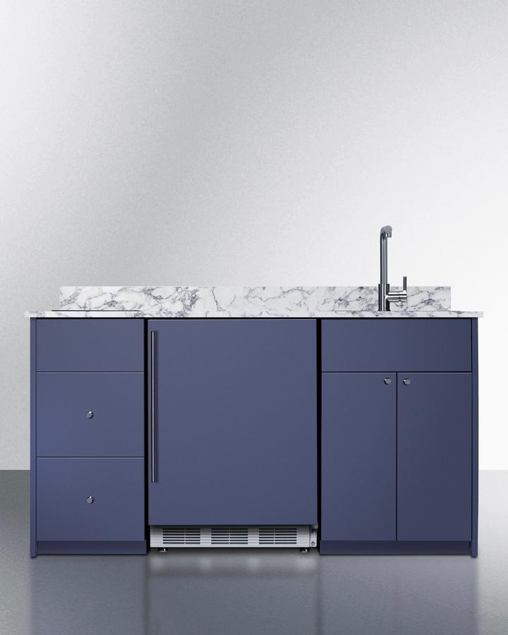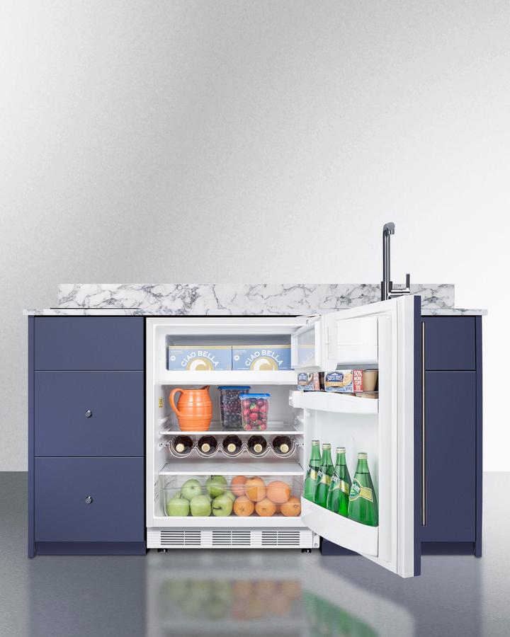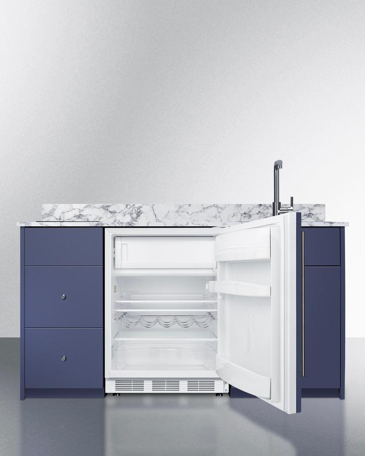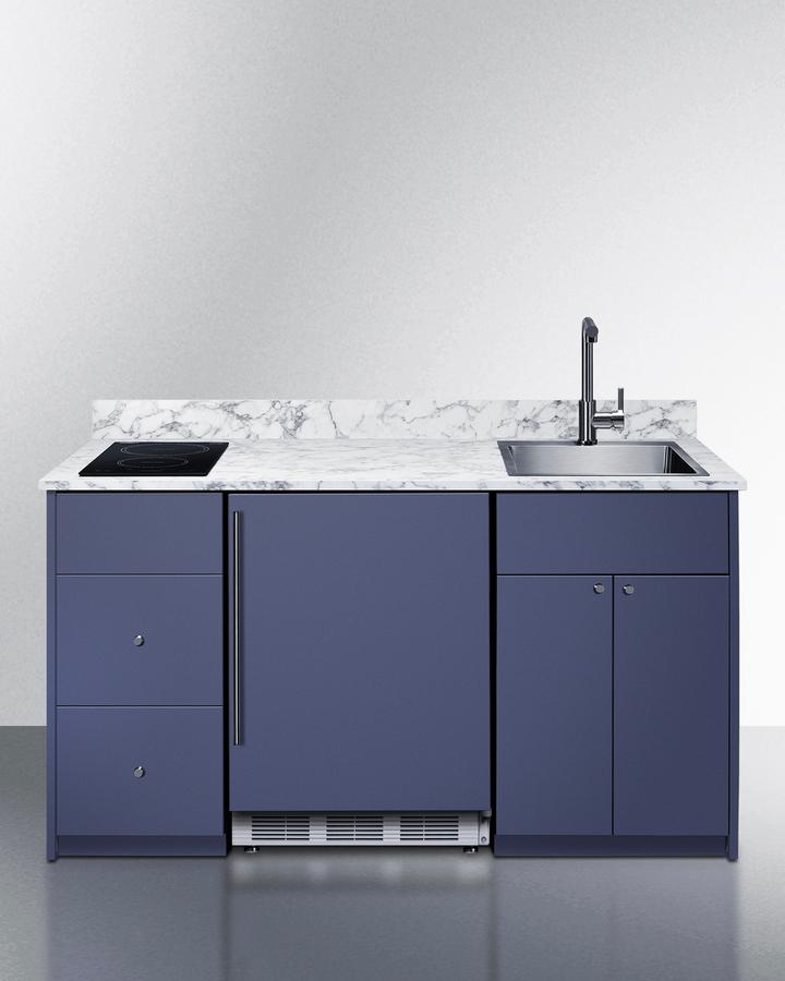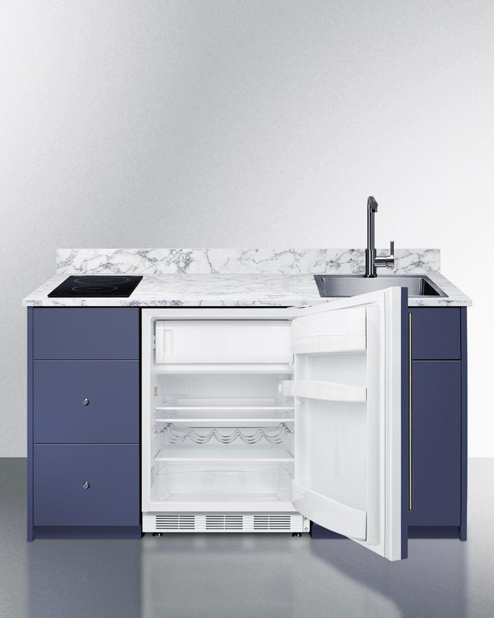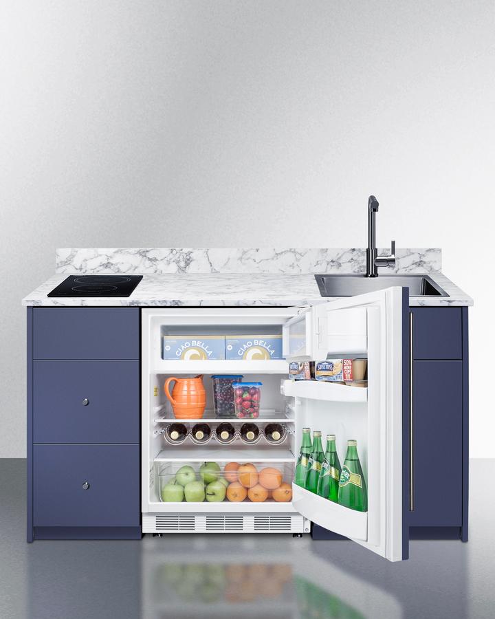 Summit's Turnkey Kitchens & Bars feature pre-installed cabinetry and matching appliances to bring effortless style & instant living to home bars, ADUs, tiny houses, rental properties, office break rooms, and hospitality settings. The Caldera is a 63" wide kitchenette in a midnight navy finish, sized just under 34" to comply with ADA guidelines for lower counter height. It features hardwood construction and a countertop made from a water-resistant laminate material with a marble look, with a pre-installed 2-burner induction cooktop included. We include a stainless steel sink with faucet and 5 cu.ft. refrigerator-freezer for food storage. For dry storage, this model has a two-door cabinet and two soft-close drawers. We also supply the door knobs in an attractive brushed nickel finish. The cabinetry comes in a modern slab style. For this unit with the sink located on the left side, see model CALDERAMN33ISINKL. Model CALDERAMN33I includes Summit's CT661WIFADA, a 24" wide ENERGY STAR certified refrigerator-freezer that utilizes automatic defrost operation in the fresh food section and manual defrost operation in the freezer to ensure items stay frozen. Inside, the CT661WIFADA includes adjustable glass shelves for spill-proof storage and easier cleaning, as well as a scalloped wine shelf to hold wine and champagne bottles safely in place. Door racks offer additional convenience for tall bottles and condiments and a clear crisper drawer ensures your produce is kept under the ideal conditions. This model includes automatic interior lighting and an adjustable dial thermostat. The door comes with a pre-installed stainless steel handle and wood panel to seamlessly blend into the cabinet. This kitchenette also features Summit's SINC2B115, an ENERGY STAR certified 12" wide 2-zone induction cooktop. The pre-installed cord includes a 3-prong NEMA 5-15P plug for fast setup. The surface is made of jet black glass for a contemporary look that is easy to clean. The rear 1800W element is sized at 8 1/4", while the front element is 6 1/4" wide and 1300W . POWER NOTE: Due to the 115V operation, a power management function limits the overall output to 1800W. The CALDERAMN33I is shipped in two boxes on one pallet. Setup involves unpacking the unit and setting into place. A professional can install the sink and connect your plumbing. Then slide the refrigerator into the cabinetry, plug into a standard 115V outlet, plug the cooktop into a separate outlet, and enjoy your new kitchen. We recommend your installation team watches the unboxing video before setup (summitappliance.com/turnkey-installation). Overall shipping dimensions are 73" H x 77" W x 31" D. Cabinetry's packaged dimensions (with refrigerator removed) is 40" H x 67.5" W x 29.5" D. Unpackaged, the final product dimensions are 33.75" H x 62.5" W x 25.5" D. With its classic design, ADA-compliant height, and easy plug-and-play setup, the CALDERAMN33I is the perfect solution to complete any home bar or hospitality space. For this unit in a classic white finish, see model CALDERAWH3I. For this unit in a standard 36" counter height, see model CALDERAMN35I. Summit s Turnkey collection also features fully assembled dry bars and wet bars designed for easy and elegant beverage service. Explore the entire Turnkey Kitchens & Bars collection at summitappliance.com