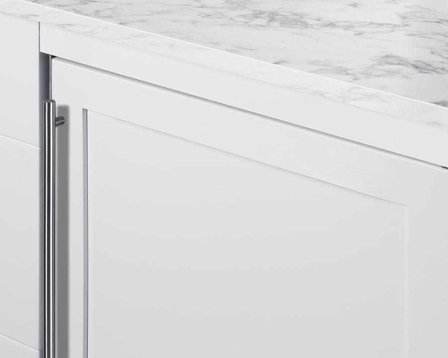 - Refrigerator-freezer comes with a pre-installed wood panel and stainless steel handle for an uninterrupted cabinetry design