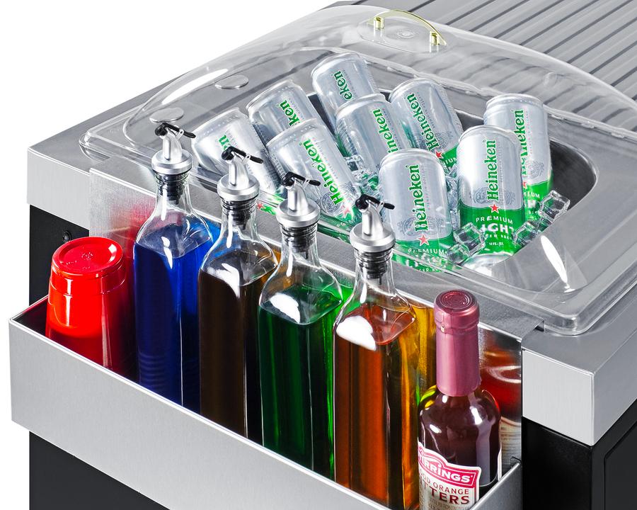 Bring new convenience to outdoor entertainment with Summit's fully featured selection of mobile outdoor kitchenettes. Model CARTOS54LS is a 58 inch wide mobile cart that comes fully featured for backyard entertaining. We include our popular ENERGY STAR certified all-refrigerator (model SPR196OSADA) for efficient, weatherproof storage of food and beverages. The refrigerator features a stainless steel door complete with a front lock, allowing you to secure items when not in use. Next to the refrigerator, two jet black cabinet doors protect your full-extension slide-out waste receptacle. We include two plastic bins that fit perfectly inside. The stainless steel work surface offers plenty of room for mixing beverages or prepping your party. A recessed cutout features a removable cutlery tray that can be covered with our durable cutting board, letting you maximize useful counter space. The left side includes a sink compartment that can be connected to your garden hose to dispense cold water. We also include a removable clear dome that covers your sink, allowing you to create your own ice bucket system to keep items chilled and protected from pests. We supply a waste drain bottle that can easily be installed under the sink area and emptied as needed. For smooth portability, the CARTOS54LS is equipped with four heavy duty caster wheels (front two are locking) and a stainless steel towel bar handle for easy steering. A stainless steel speed rail is installed on the left side for convenient dry storage. This unit is constructed from stainless steel and powder-coated metal. We include a vinyl cover to help protect the unit from the elements when not in use. In addition to this unit, we also manufacture a cart with a glass door beverage center (model CARTOS54LG), as well as a full assortment of built-in outdoor refrigerators, freezers, kegerators, icemakers, and more. Browse the full Summit product line to discover the perfect solution for any outdoor kitchen space.
