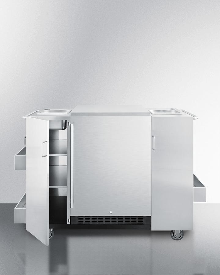 SUMMIT's CartOSRF brings luxury and convenience to the outdoors in a stainless steel serving cart with our leading outdoor refrigerator. This 61" wide unit lets you create an upscale kitchen right in your own backyard, beginning with ample storage space. Keep items on three exterior shelves and inside magnetic locking doors fitted with elegant towel bar handles. The cart includes room for ice storage and a removable stainless steel countertop. In the center of the cart, we install the SPR627OS outdoor refrigerator, designed for quality cooling that requires low maintenance. Frost-free operation ensures low maintenance, while the digital thermostat makes it easy to manage the temperature. This unit includes a factory installed lock, LED lighting, and a pro style handle. It has a reversible stainless steel door and black cabinet. The CartOSRF features weatherproof construction to provide years of luxury entertaining in the outdoors.