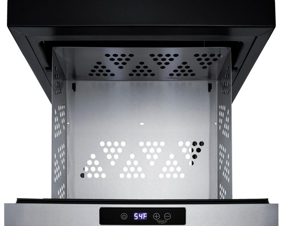 Summit manufactures a unique assortment of built-in single drawer appliances, including our new 18" wide solid state wine and beverage cooler ideal for home kitchens, hotel spaces, corporate offices, back bar settings, and more. Model COOL1D is a 1-drawer wine and beverage chiller that utilizes an efficient and quiet solid state cooling system. The stainless steel drawer features a fully finished front with a horizontal grain to match any setting, with a pro-style handle included. The drawer front can also accept an overlay panel for a more customized look to blend or complement adjacent cabinetry (panel size: 17.87" W x 11.9" H at a 3/4" thickness). This cooler is designed to be installed in cabinet openings sized at 12" H x 18" W x 22.5" D and requires a 5.11" x 2.36" ventilation channel above the cabinet in the rear for proper operation. Alternatively, we include a stainless steel front grill that raises the height an additional 2" to account for the exhaust. Designed for the storage of wine and beverages, the COOL1D includes intuitive digital controls that let you adjust the temperature between 46 and 68 F. The temperature readout is switchable between Fahrenheit and Celsius to best suit your preference. An audible/visual alarm warns if the drawer has been left open for more than 5 minutes. Two LED lights in a white hue provide attractive illumination when the drawer is opened. Sabbath mode allows you to disable the interior light and digital temperature display as needed. We include two removable wine shelves that let you store standard Bordeaux style bottles at a slight angle, making it easy to keep open bottles in reach with the necks facing forward. This layout allows you to store 4 bottles on the shelves and an additional 2 on the bottom of the drawer. By removing the shelves, you can store up to 8 bottles, or a variety of soda cans, water bottles, mini liquor bottles, and more. With its mild temperature range and elegant design, the COOL1D is also ideal for the storage of skincare products such as face masks, serums, creams, and other cosmetics that function better in cooler temperature conditions. With its uniquely small size and versatile performance, the COOL1D is ideal for a variety of spaces looking to elevate undercounter openings with an attractive, functional cooling system. It can be installed in home kitchens or wet bars, corporate spaces, bathroom settings, walk-in closets, hotel suites, and much more.