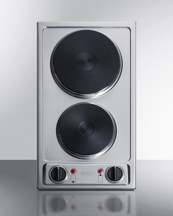 Summit's selection of electric 115V cooktops offers the perfect fit for every application, including our unique line of solid disk elements designed for maximum durability. Sized at 12" wide, the CSD2B115 is a 115V cooktop with two solid disk elements. The pre-installed power cord includes a right angle 3-prong plug for easy installation in common cutouts sized at 10 1/2" W x 19 1/4" D. Upfront push-to-turn knobs meet ADA guidelines for user accessibility while also ensuring maximum safety. This cooktop surface comes in brushed stainless steel for an attractive look built to last. The rear 900W burner is sized with an 8" diameter to fit large cookware, while the front 500W 6" element accommodates smaller pots and pans. The solid disk elements are constructed from cast iron, ensuring extreme durability. These elements also retain heat longer than traditional coil or glass top surfaces, making them ideal for keeping the contents in your pots and pans warmer before serving. Even heat distribution helps to improve your cooking results. With its modern style and durable design, the CSD2B115 is a great choice for hotels, mobile homes, tiny houses, ADUs, temporary housing, and other small kitchens with specific cooking needs. Additional 115V cooktops are available in coil, radiant, and induction style, as well as 230V solid disk cooktops in 2 and 4-burner configurations. Browse the full Summit line to find the perfect choice for your kitchen.