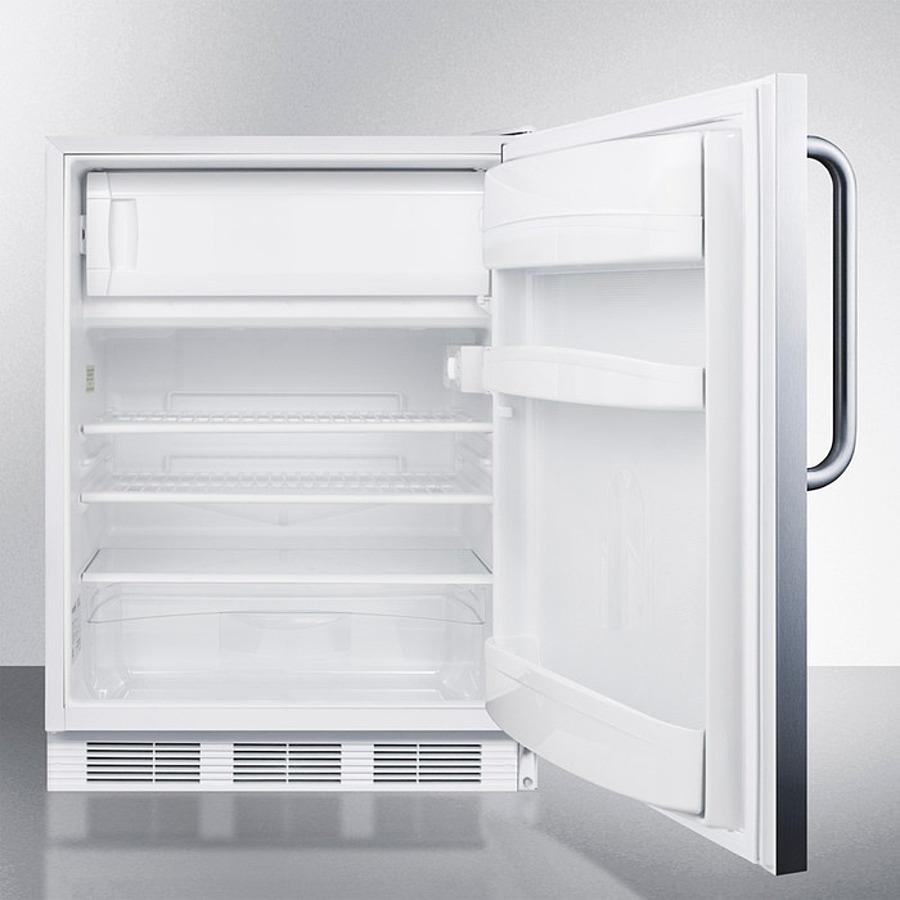 Accucold by Summit Appliance offers a wide range of undercounter refrigeration for general purpose storage. The CT66JBI Series includes built-in undercounter refrigerator-freezers equipped with dual evaporator cooling for optimum storage conditions. Sized with a 24" footprint, the CT66LWCSS can be used built-in under counters or freestanding. The interior offers over 5 cu.ft. of storage capacity. This model comes with a fully wrapped stainless steel cabinet and door. A curved towel bar handle completes the professional look and a factory installed front lock offers convenient security. Inside, our unique dual evaporator system separately cools the refrigerator and freezer section to ensure proper storage temperature. Cycle defrost operation reduces user maintenance in the automatic defrost fresh food section, with static manual defrost operation in the freezer compartment. Door storage provides easy access for tall bottles and small condiments. Additional features include adjustable shelves, a clear crisper, and automatic interior lighting. The CT66LWCSS has long proven itself to have one of the best temperature performance records in the industry. To see additional finish options on this unit, browse the full CT66WBI Series. NOTE: This unit is designed for general purpose applications and does not meet DOE energy standards for residential use.