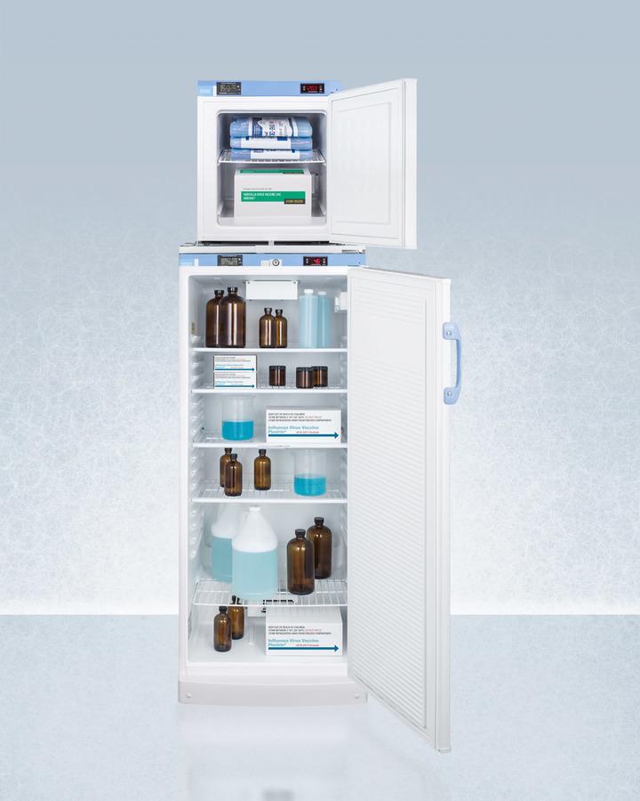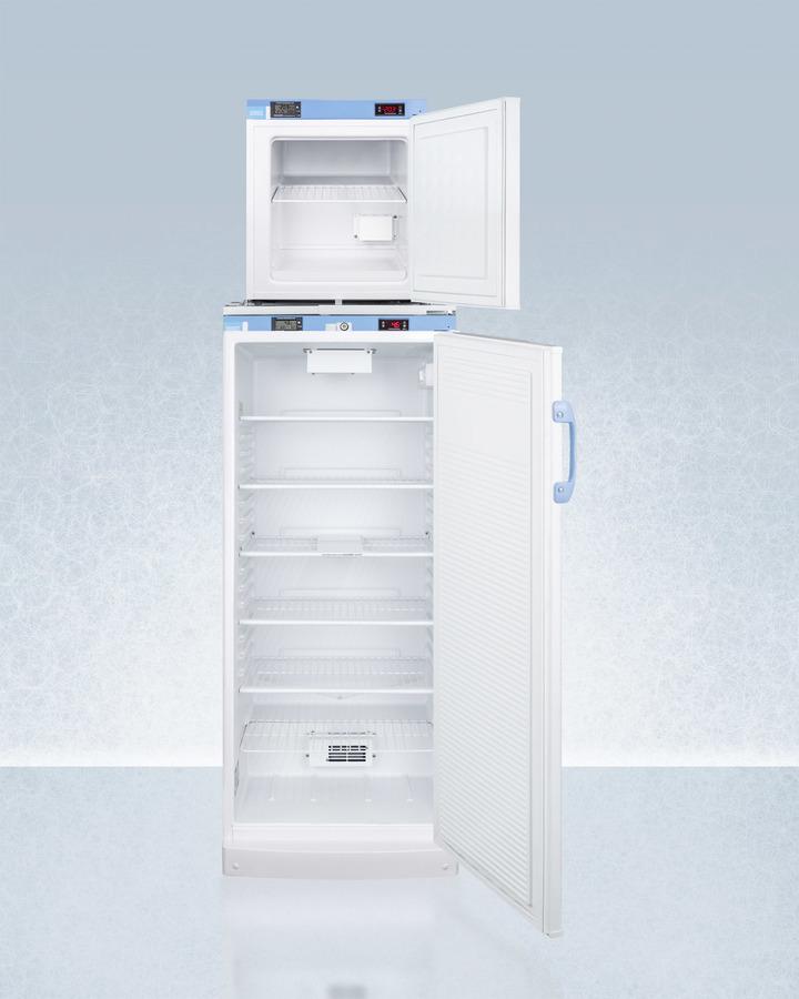 Accucold offers innovative solutions to vaccine storage with the STACKMED2 stackable refrigerator-freezer combination series. Sized just under 24" wide, the FFAR10-FS24LSTACKMED2 combines our full-sized FFAR10MED2 auto defrost all-refrigerator with the compact FS24LMED2 all-freezer in one slim footprint. Made in Europe, the FFAR10MED2 offers 10.1 cu.ft. of storage, with fan-forced cooling and adjustable wire shelves to ensure an even temperature distribution. The FS24LMED2 freezer utilizes static manual defrost cooling. Both units feature front-located control panels equipped with digital thermostats and NIST calibrated thermometers with high/low temperature alarms. Calibration is done in our ISO/IEC certified laboratory. The buffered temperature probes are encased in a glycol-filled bottle and secured inside the center shelf to best simulate the temperature of other stored contents, resulting in the utmost accuracy for temperature reporting. We include a pre-installed 3/8" probe hole for users who wish to install additional monitoring equipment in the rear of both units. Additional features include front locks and hospital grade cords. Products in the MED2 series come with a two year warranty on parts and labor and a five year warranty on the compressor. All Accucold STACKMED2 units ship in three boxes and require some minor assembly upon delivery. Additional stacked combinations can be created by ordering virtually any two units with our StackRack. These units can also be customized with a variety of refrigeration options, including NIST calibrated thermometers, USB data loggers, open door alarms, and much more. To create a custom combination, contact our sales team at 718-893-3900. *NOTE: Thermostats come pre-set for Celsius. If you prefer Fahrenheit, add complimentary option DTMEDF or let your sales representative know upon order.