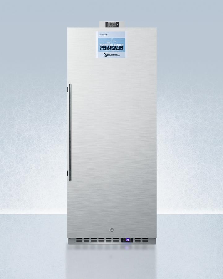 Accucold's Nutrition Center Series features commercially approved refrigerators and freezers specifically designed for the storage of sealed food and beverages in a variety of facilities, including break rooms, waiting areas, nurses' stations, and more. The FFAR121SSNZ is an upright all-refrigerator sized with a 24" footprint and generous 10.1 cu.ft. capacity. It is ETL-S listed to NSF-7 standards for the storage of sealed food and beverages. The top cabinet includes a factory-installed digital thermometer that provides a continuous external display of the current and minimum/maximum temperature to the nearest tenth of a degree, making it easier for staff to monitor and record the temperature as needed. This device includes a built-in audible alarm that will sound if the unit rises or falls out of the set temperature range. The temperature probe is encased in a glycol-filled bottle to best simulate the temperature of stored contents. All temperature display devices are calibrated to NIST standards in our ISO/IEC 17025:2017 laboratory and include a certificate of calibration. Inside, the FFAR121SSNZ utilizes low maintenance automatic operation. The interior is made from stainless steel for lasting durability and easier cleanup. Four chrome shelves are included with a cantilevered system that allows you to position your storage in virtually any configuration. The flat door liner helps to maximize the interior depth. This unit features LED lighting and an open door alarm that will sound if the door is left opened for over one minute. The digital thermostat is located in the kickplate. The FFAR121SSNZ comes in a white cabinet and a user-reversible stainless steel door with a front lock. This unit includes a hospital grade cord with a 'green dot' plug that stays more securely in wall sockets, a key feature in busy institutional settings. The sealed back design ensures easier cleanup and the front-breathing design allows built-in or freestanding use. Designed specifically for institutional food and beverage storage, all Accucold's Nutrition Centers are commercially approved to NSF standards and comply with most JCAHO recommendations for safe storage. Additional sizes and variations are available.