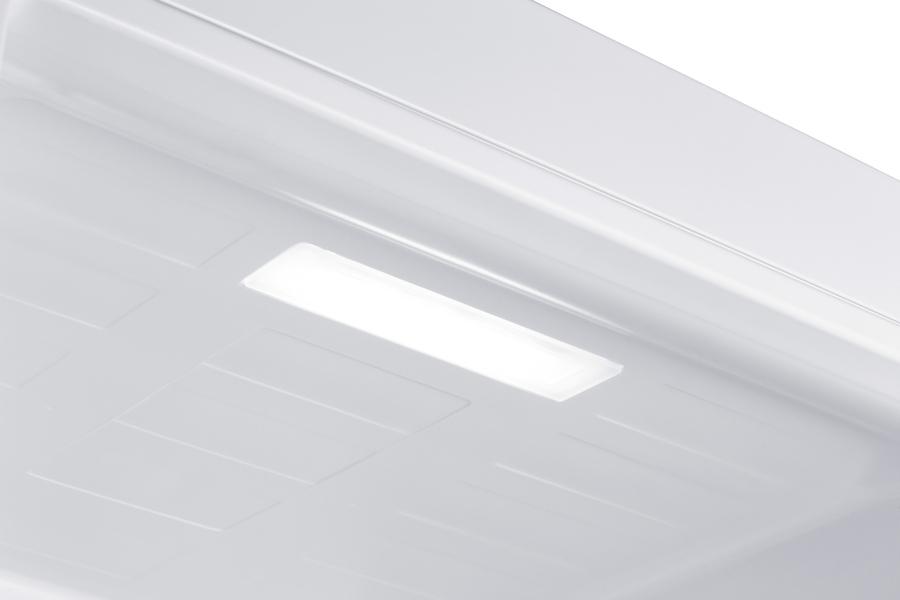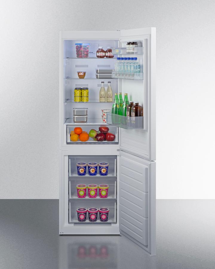 Summit's fully-featured, European-made bottom freezer refrigerators are specially designed to bring true convenience to any kitchen. The ENERGY STAR certified FFBF121W features a spacious 11.7 cu.ft. of storage capacity in a slim counter depth fit. The smooth white doors and cabinet offer contemporary kitchens a traditional aesthetic. This unit utilizes frost-free defrost to minimize user-maintenance, with digital controls for easy operation. The doors are user-reversible to best suit your space. The FFBF121W's refrigerator section is fully featured for fresh food storage with LED lighting, three adjustable glass shelves, a humidity-controlled clear crisper, and three removable door racks. The unit's bottom door shelf accommodates gallon-sized containers. The lower freezer compartment features three slide-out drawers with plastic fronts to help protect stored items when the door is opened. This model also features a SuperFreeze setting, which is great for quickly freezing newly loaded foods. With its ENERGY STAR certified performance and convenient features, the FFBF121W is the ideal choice for apartments looking for an energy-efficient refrigerator-freezer. For this unit in a sleek stainless steel finish, see model FFBF124SS. Explore summitappliance.com to browse our complete series of apartment-sized refrigerators.