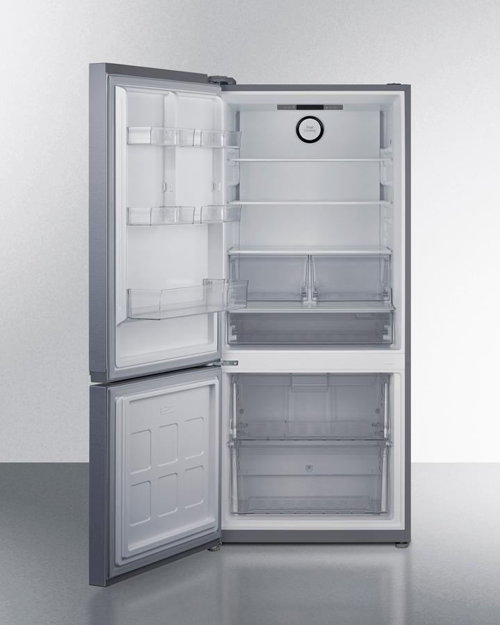 Summit's fully-featured, bottom-mount refrigerator-freezers are specially designed to bring modern style and true convenience to any kitchen. The ENERGY STAR certified FFBF173SSLHD is conveniently sized at 30" wide. Stainless steel doors feature pocket handles and an attractive horizontal grain, with a smooth silver cabinet for a stylish modern look in any kitchen. The sealed back offers added space savings and easier cleanup. Both doors are user-reversible to best suit your space. Inside, the FFBF173SSLHD boasts a generous 16.1 cu.ft of storage space to meet the storage needs of any family, no matter their size. This model utilizes frost-free operation for low user maintenance. The interior includes three adjustable glass shelves, two half-width produce crisper drawers, and a full-width deli drawer for easy storage. The refrigerator door includes four half shelves and one full gallon shelf to safely store bottles and other condiments. An innovative digital system lets you manage the refrigerator and freezer temperature with an intuitive digital thermostat. LED lighting in the side walls of the refrigerator offers an efficient and attractive view inside. The open door alarm alerts with an audio and visual signal when the door is left ajar for over one minute. This unit is equipped with an optional sabbath mode feature that allows you to deactivate certain electrical features for up to 72 hours. The FFBF173SS's large freezer section features one plastic slide-out drawer that help protect your stored items from warmer temperatures when the door is opened. A QuickFreeze setting lets you run the freezer at colder temperatures, ideal for freezing newly loaded groceries. With its ENERGY STAR certified performance, attractive design, and convenient features, the FFBF173SSLHD is the ideal choice for kitchens looking for an energy-efficient refrigerator-freezer. For this unit in classic white, see model FFBF172WLHD. For this unit with a factory-installed icemaker, see model FFBF174SSIMLHD.