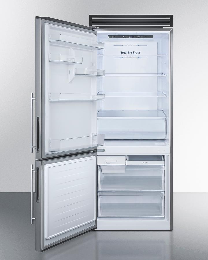 Summit's counter depth series of ENERGY STAR qualified frost-free refrigerator-freezers provides attractive, user-friendly, and incredibly efficient solutions to bringing full storage convenience to small kitchen spaces. The FFBF279SSXH72LHD is conveniently sized at 27 5/8 inches wide and just under 27 inches deep, with a generous 14.6 cu.ft. capacity to meet a family's storage needs in minimum floor space. The stainless steel doors feature an attractive horizontal grain and stainless steel handles for a professional look. We include a decorative steel grill accessory in matte black for optional installation on top of the cabinet, allowing you to fill extra vertical space depending on your kitchen cabinetry height. This unit ships with a left hand swing (for a right hand version, see model FFBF279SSXH72). The sealed back offers added space savings and easier cleanup. Inside, the FFBF279SSXH72LHD utilizes frost-free operation for low maintenance use. The digital controls ensure easy temperature management. It also includes a holiday setting, which allows the refrigerator to run at warmer temperatures to help save energy when not in use during vacation or other extended periods of inactivity. The refrigerator section features automatic LED lighting for an attractive, energy efficient view. Adjustable glass shelves and a full-width crisper drawer ensure easy storage. The door includes three full shelves and two adjustable half racks to best accommodate bottles and other condiments. The large freezer section features two slide-out drawers in clear plastic, helping to protect your stored items from warmer temperature when the door is opened. A "super freeze" setting lets you run the freezer at colder temperatures, an ideal feature when loading new groceries. This model is equipped with a twistable manual ice tray that lets you make miniature cubes and drop them into a removable small bucket. With its unique footprint and ENERGY STAR certified performance, the FFBF279SSXH72LHD is a great solution for apartments and other space-challenged kitchens in need of a fully functioning refrigerator in a slim-fitting size.