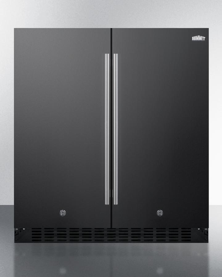 SUMMIT brings quality and value under the counter with the industry s largest collection of built-in refrigeration. Sized at 30" wide, the FFRF3070B is an all-in-one side-by-side refrigerator-freezer. The front breathing design allows built-in installation under counters, while the fully finished cabinet also enables freestanding use. This unit features a jet black exterior with stainless steel handles. Each compartment has a factory installed front lock for added security. The sealed back ensures easier cleanup with added space savings. Inside, the FFRF3070B features a 2.4 cu.ft. frost-free freezer compartment on the left and a 3 cu.ft. frost-free refrigerator compartment on the right. The refrigerator includes a digital thermostat allowing users to manage the temperature in each compartment, with a readout in Celsius or Fahrenheit for added convenience. Adjustable glass shelves offer cleaner spill-proof storage for fresh food items, while two removable door shelves provide additional storage space as needed. An internal fan assures the compartment is cooled evenly from top to bottom. The freezer compartment includes adjustable wire shelves to ensure proper cold air circulation. Both sides feature LED lighting to provide an attractive, energy efficient presentation. The slotted floor design is ideal for keeping bottles safely in place. Additional features include an open door alarm, high temperature alarm, and Sabbath mode setting that allows you to disable certain functions during religious observance. With its innovative all-in-one design, user-friendly features, and full frost-free operation, the FFRF3070B is a great choice for smaller kitchens looking to maximize storage space under the counter.