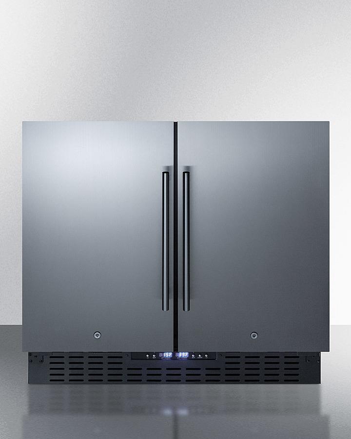 SUMMIT brings quality and value under the counter with the industry s largest collection of built-in refrigeration. The FFRF36 features a versatile design that meets NSF-7 and UL-471 commercial standards but is also approved for residential use. Sized at 36" wide, this all-in-one, side-by-side refrigerator-freezer is designed for built-in or freestanding installation. This unit features a jet black cabinet and stainless steel doors complete with pro style handles. Both sections include factory-installed keyed locks for added security. Digital controls are located in the kickplate, allowing you to adjust the temperature without opening the door. This unit has a sealed back design to enable easier cleanup and added space savings. Inside, the FFRF36 features a 2.9 cu.ft. frost-free freezer compartment on the left and a 2.9 cu.ft. frost-free refrigerator compartment on the right. Both sections are frost-free for easy maintenance, with internal fans to help provide even cooling. The refrigerator compartment includes three adjustable glass shelves with five placement options that offer multiple spill-proof storage options. The freezer compartment includes three adjustable chrome shelves for proper cold air circulation. Additionally, the freezer section can be converted to run as a refrigerator, allowing you to adjust the temperature range to best accommodate your storage needs at the touch of a button. With its innovative all-in-one design, user-friendly features, and frost-free operation, the FFRF36 is a great choice for smaller kitchens looking to maximize storage space. NOTE: Due to its larger commercial design, the FFRF36 requires an additional 5/8" of width for each door to open to a full 90 . If placing this unit against a right angle wall, be sure to accommodate this extra space.