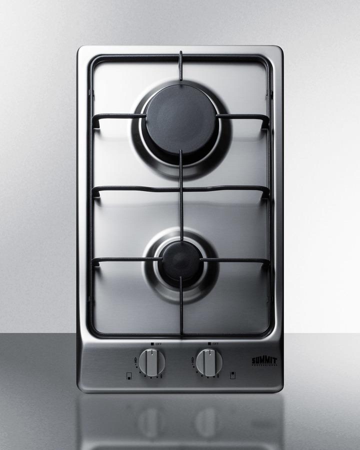 Made in Italy for SUMMIT, our deluxe line of gas cooktops offers the ideal cooking experience for modern kitchens. The GC22SS is a two-burner gas cooktop with a stainless steel surface that offers lasting durability and modern style. Continuous cast iron grates make it easier to cook and clean. This model features a rear 10,000 BTU Sabaf burner and front 3,550 BTU Sabaf burner to ensure quality heating that meets your needs. The surface features a unique curved design that adds to the attractive look. This cooktop uses electronic spark ignition and comes preset for natural gas operation. We include a conversion kit that lets you adjust for LP gas. Safety features include color-matched push-to-turn knobs, sealed burners, and thermocouple flame failure protection to ensure gas will turn off within 12 seconds if the flame is extinguished. With its modern styling and quality construction, the GC22SS is the ideal gas cooktop for smaller kitchens looking to make the most out of limited counter space.