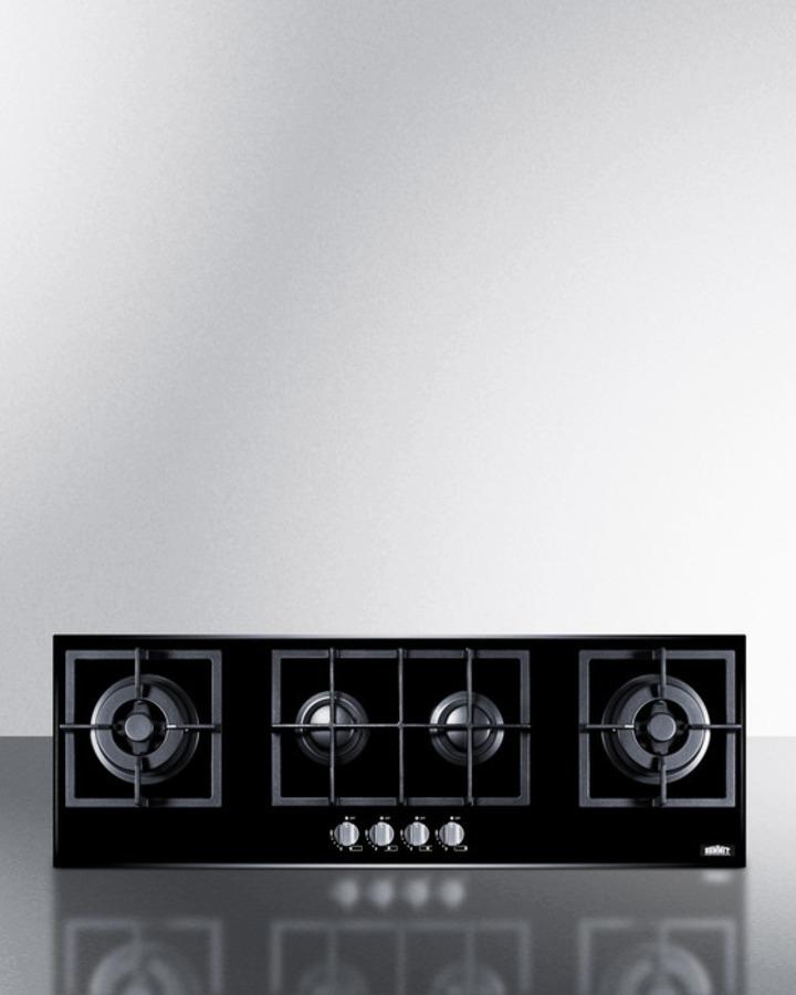 Made in Italy for SUMMIT, our deluxe gas-on-glass cooktops offer the ideal cooking experience for modern kitchens. The GC443BGL is a four-burner island cooktop made from tempered black glass for a sleek look that's easy to clean. Continuous cast iron grates let you slide cookware back and forth for added convenience. The combination of two 4,350 and two ultra 10,300 BTU burners allows you to accommodate all sorts of cooking, from a saut(eback) to gentle simmer. The sealed Sabaf® burners feature cast iron tops for lasting durability and easy cleanup. The GC443BGL uses electronic spark ignition and comes preset for natural gas operation. We include a conversion kit that lets you adjust for LP gas. Safety features include push-to-turn knobs, sealed burners, and a thermocouple flame failure protection to ensure gas will turn off if the flame is extinguished.