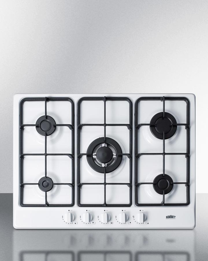 Made in Italy for SUMMIT, our deluxe gas cooktops offer the ideal cooking experience for modern kitchens. The GC5271W is uniquely sized at 27" wide but with a design that fits many standard 24" cutouts, with five burners to help you maximize your cooking power in a more efficient use of counter space. Continuous cast iron grates are designed to hold up to heavy duty pots and pans, making it easy to side cookware from one burner to another. The classic white surface is constructed from painted enamel steel. White color-matched knobs are centrally located for easy use and require a gentle push-to-turn motion to prevent accidents. This unit is equipped with thermocouple flame failure protection to ensure gas will turn off if the flame is extinguished. It utilizes electronic spark ignition and comes with a pre-installed 115V power cord. Five sealed Sabaf burners provide a range of cooking power to help accommodate a variety of heating needs. The center ultra rapid 11,000 BTU burner includes a dual flame and removable cast iron wok stand to offer more even heating for large cooking vessels. The right rear burner offers a 10,000 BTU cooking performance, ideal for boiling pots of water or cooking large dishes. The front right and rear left semi-rapid 6,100 BTU burners meet most general cooking needs, while the auxiliary 1,200 to 3,550 BTU front left burner allows you to achieve more precision in gentle heating. The GC5271W comes preset for natural gas operation. We include a conversion kit that lets you adjust for LP gas connections. We also offer customized stainless steel trim kits to allow this cooktop to fit into a wider cutout. For details, see the TK Custom. To fit standard 30" wide cutouts, see the GC5271WTK30.