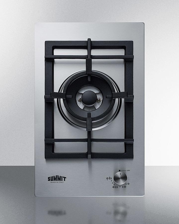 Summit s Made in Italy gas cooktops offer a powerful performance in a durable, safe, and stylish design. The GCJ1SS is a one-burner gas cooktop ideal as an add-on to kitchens and for families who would like additional burner capacity. A 304 grade stainless steel surface with smooth edges makes for an elegant look, while the cast iron grate adds durability to the cooktop. The heavy-duty round knob delivers additional safety by requiring a gentle push-to-turn motion to ignite, with thermocouple flame protection to ensure the gas turns off if the flame goes out. Featuring a burner manufactured by Defendi, this cooktop has a variety of heating options in a slim design. The dual burner has a 15,300 BTU output, with an included cast iron wok ring for quick heating of larger cooking vessels. The inner flame can reach up to 2,050 BTUs for lower heat applications. The GCJ1SS uses electronic spark ignition and is preset for natural gas operation. A conversion kit that allows for LP gas connection is included. A standard three-pronged 115V cord is pre-installed for easy hookup. The 'Made in Italy' collection has gas cooktop options to fit any cooking need, including two, four, and five burner choices. Browse our website to explore the full collection.