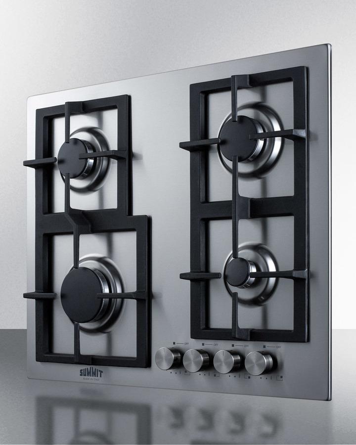 Summit s 'Made in Italy' LP gas cooktops offer a powerful performance in a durable, safe, and stylish design. The GCJ4SSLP is a four-burner gas cooktop with a 304 grade stainless steel surface for added durability. In a space-saving size of 24 inches, it is perfect for smaller kitchens, apartments, and similar space-challenged environments. Two continuous cast iron grates in an off-center design afford extra space when cooking with multiple pots and pans that can otherwise collide on tighter surfaces. Heavy duty brass and aluminum knobs are located at the front of the unit for convenient access. The knobs require a gentle push-to-turn motion to ignite, and the thermocouple flame protection ensures the gas turns off if the flame goes out. Featuring four gas burners manufactured by Defendi, this cooktop has a variety of cooking options for unparalleled performance. The top left and right 6000 BTU semi-rapid burners suit most cooking needs. The bottom right 10,000 BTU rapid burner is ideal for boiling water or cooking larger dishes, while the bottom-right 3,400 BTU auxiliary burner works well for precision heating and cooking. The GCJ4SSLP uses electronic spark ignition, with a pre-installed 115V 3-prong cord included. This cooktop is preset for use with propane. We include a conversion kit that allows you to switch the connection from LP to natural gas. The 'Made in Italy' collection has gas cooktop options to fit any cooking need, including one, two, four, and five burner choices. Browse our website to explore the full collection.