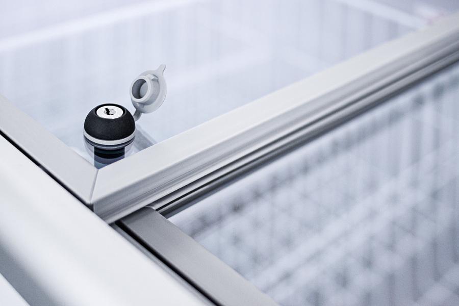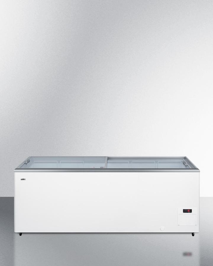 Summit Commercial's line of flat top ice cream freezers features a deluxe European design to provide quality storage and long-lasting convenience. Made for us by Elcold in Denmark, the NOVA61 features two tempered glass lids on ball-bearing glides that open and close smoothly to save your staff time and ensure ice cream isn't overexposed to warmer air temperature. This unit includes a removable keyed lock to allow users the option of securing their goods. The white cabinet suits any setting, while the gray lid trim offers an added touch of clean style. We include a set of sturdy commercial casters for users to install if they prefer the freezer more mobile. The digital thermostat is externally located for easy temperature management, with a wide range from -13 to 23 F to accommodate a variety of desserts. We pre-set the unit to -4 F. Inside, the NOVA61 features a steel interior in a clean white finish designed for lasting durability in busy commercial settings. We include five epoxy coated wire novelty baskets, ideal for storing frozen treats and designed to easily glide back and forth as needed. This unit utilizes a manual defrost cooling system with environmentally friendly R290a cooling agent and extra thick insulation to ensure added reliability. A drain is included for easy defrosting. The NOVA61 is UL-S listed to NSF-7 commercial standards. Additional sizes are available.