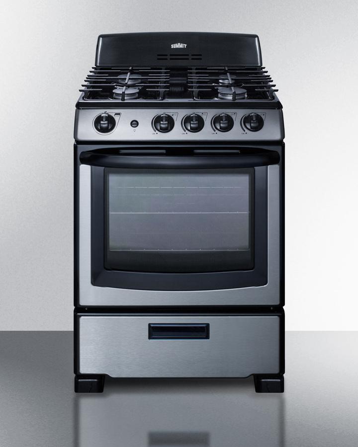 SUMMIT's line of slim-fitting gas ranges made in North America brings quality and value to space-challenged kitchens. The PRO247SS is sized at just 24" wide for an easy fit in smaller kitchen spaces. The front manifold, oven door, and broiler front feature a stainless steel finish, with a black trimmed oven window, handle, and backguard for a modern look. The oven includes a large window, interior light, and easy-grip handle for cooking convenience.This model utilizes electronic spark ignition and features four sealed burners for safer, cleaner cooking. One 12,000 BTU burner offers faster cooking for larger vessels, with two standard 9,500 BTU burners and a smaller 5,000 BTU burner for lower heating needs. Two sets of continuous grates feature a lightweight but durable cast iron design. The control panel includes upfront push-to-turn burner knobs for added safety. Inside, the PRO247SS features a 2.9 cu.ft. porcelain oven. Two slide-out racks include a safety brake system, with four position options to let you accommodate all sizes and shapes. The broiler is located in a lower drop-down compartment with a convenient pocket handle. We include a two-piece broiler pan with lid. The unit ships set for natural gas but includes its own LP kit for aftermarket conversion. With its clean look and unique size, the PRO247SS is the ideal gas range for apartment and small home kitchens. NOTE: This unit replaces model PRO246SS but features an upgraded sealed burner design.