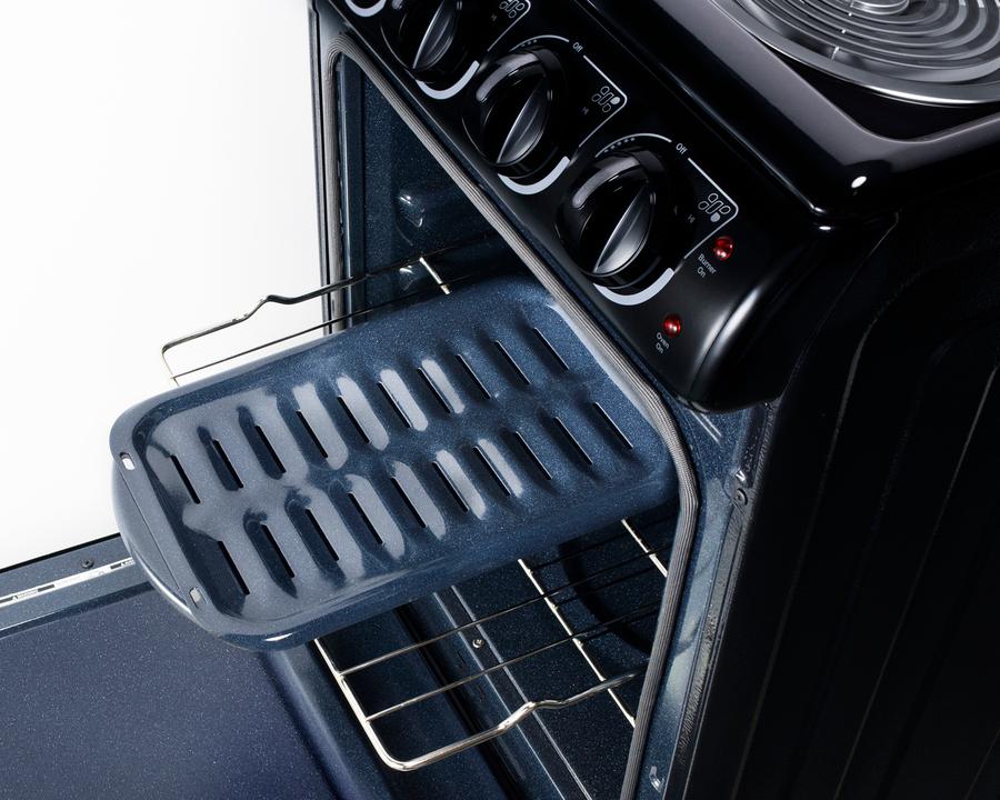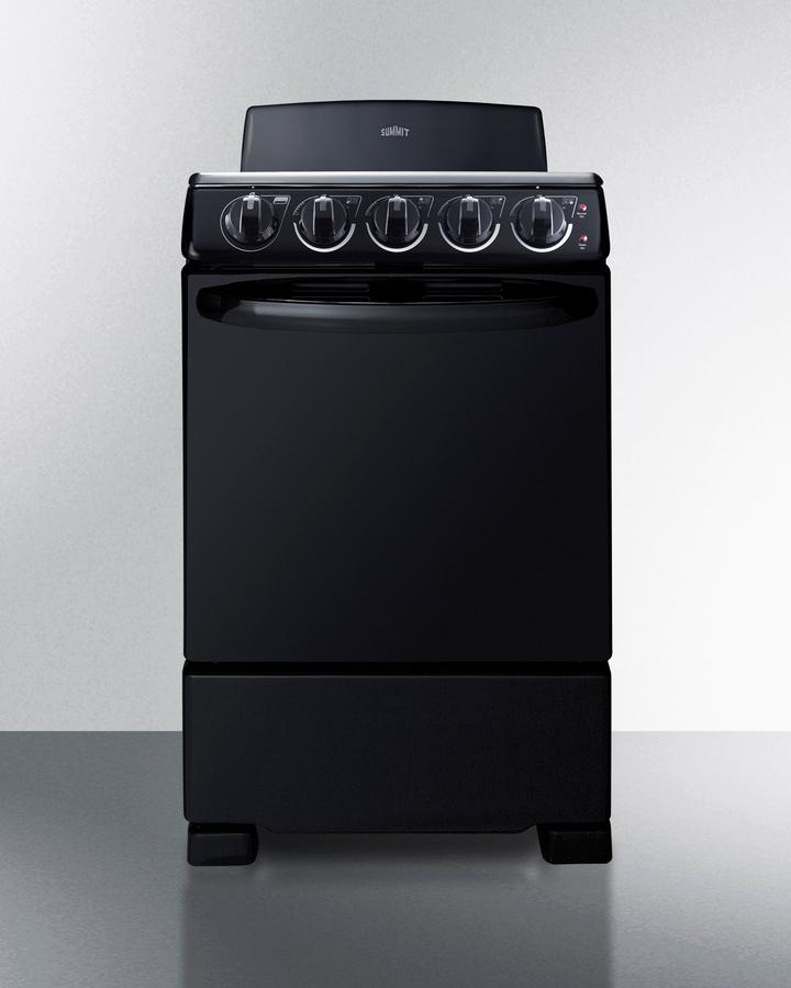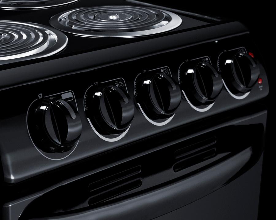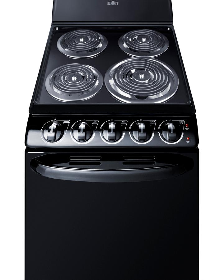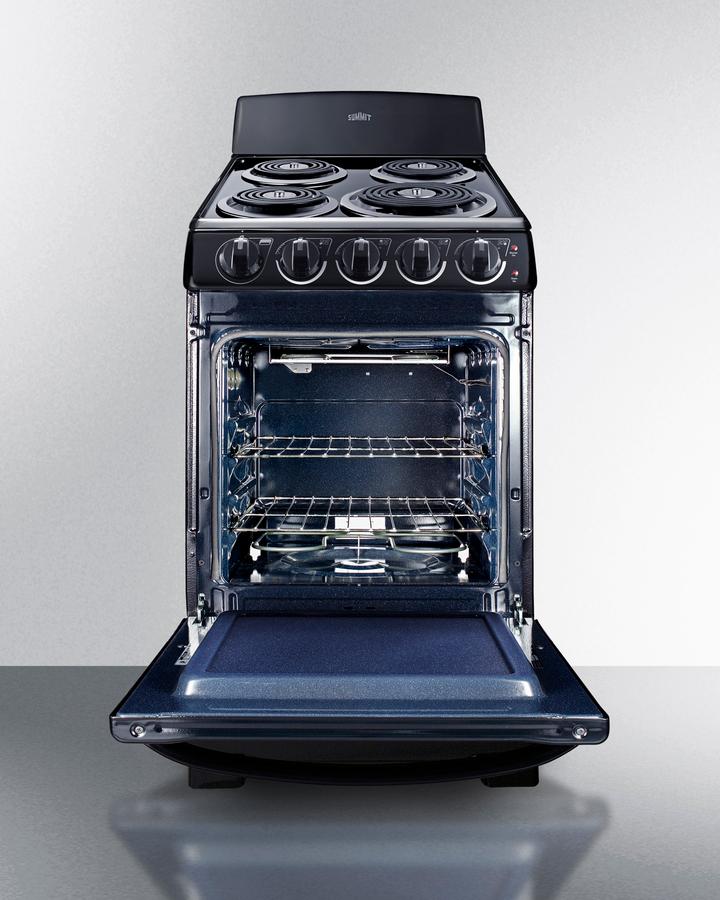 Summit brings unmatched value and convenience to apartments, tiny homes, and other small kitchens with fully featured electric ranges in 20" wide fits. Made in North America, the RE2031B is a 240V electric range designed for 20" wide spaces, featuring one 8" and three 6" coil burners. For added safety, each coil is equipped with a sensor that will automatically cycle the element off if it reaches dangerous flashpoint temperatures. Heating will resume automatically. All cooking controls are located upfront on push-to-turn knobs for safe and easy use. Indicator lights illuminate when the oven is in use. The RE2031B features a large 2.3 cu.ft. oven made from durable porcelain, with two adjustable racks. The waist-high broiler is conveniently located inside, letting you finish your cooking without transferring contents to an inconvenient drop-down compartment on the floor. The RE2031B comes in a black exterior finish with a color-matched handle and knobs. With its slim fit and quality design, this unit is the ideal choice for space-challenged kitchens on a budget. For this unit in white or stainless steel, see models RE203W and PROEL20SS. Summit also manufactures 24" wide choices, smooth-top ranges, and gas units. Browse our website to explore the complete cooking collection.
