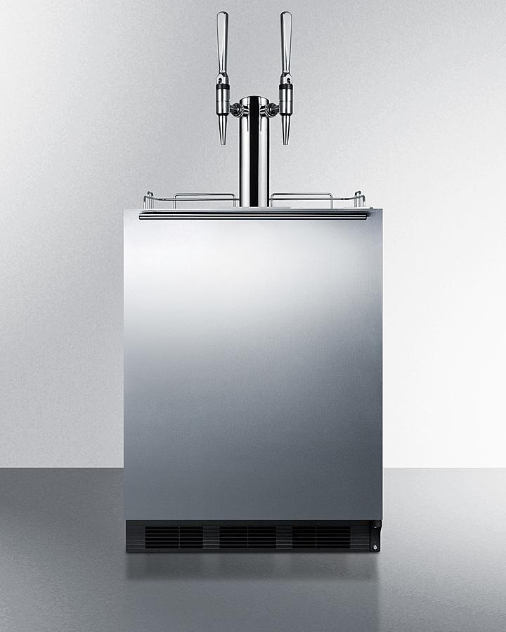 Summit Commercial brings unique appliance choices to ADA compliant settings with a new line of commercial coffee dispensers made in Europe. Sized at 32 inches high, the SBC58BLBIADANCFTWIN is designed to fit under lower ADA compliant counters. The front-breathing design allows built-in installation, while the fully finished black cabinet also enables freestanding use. This unit features a user-reversible 304 grade stainless steel wrapped door complete with a stainless steel handle mounted horizontally for a modern look. We include a removable two-piece stainless steel drip tray for cleaner service. This unit ships with an NSF-listed stainless steel tap kit that includes everything you need to serve nitro cold brew coffee, including a standard dual tap draft tower, regulator, and nitrogen tank. Inside, the SBC58BLBIADANCFTWIN is designed to hold two 1/6 (sixtel) kegs (note: interior does not accommodate a standard half barrel). Automatic defrost ensures easy user maintenance, with a seamless interior for easier cleaning. The stainless steel floor offers added durability when loading kegs. This unit includes an interior light with an on/off rocker switch and a dial thermostat for easy and intuitive temperature management. The nitrogen tank bracket is located inside, allowing you to keep the tank inside and save on exterior depth. The SBC58BLBIADANCFTWIN is ETL-S listed to NSF-7 commercial standards. Additional ADA compliant kegerator choices are available with panel-ready or glass doors. Browse our complete line for more choices.