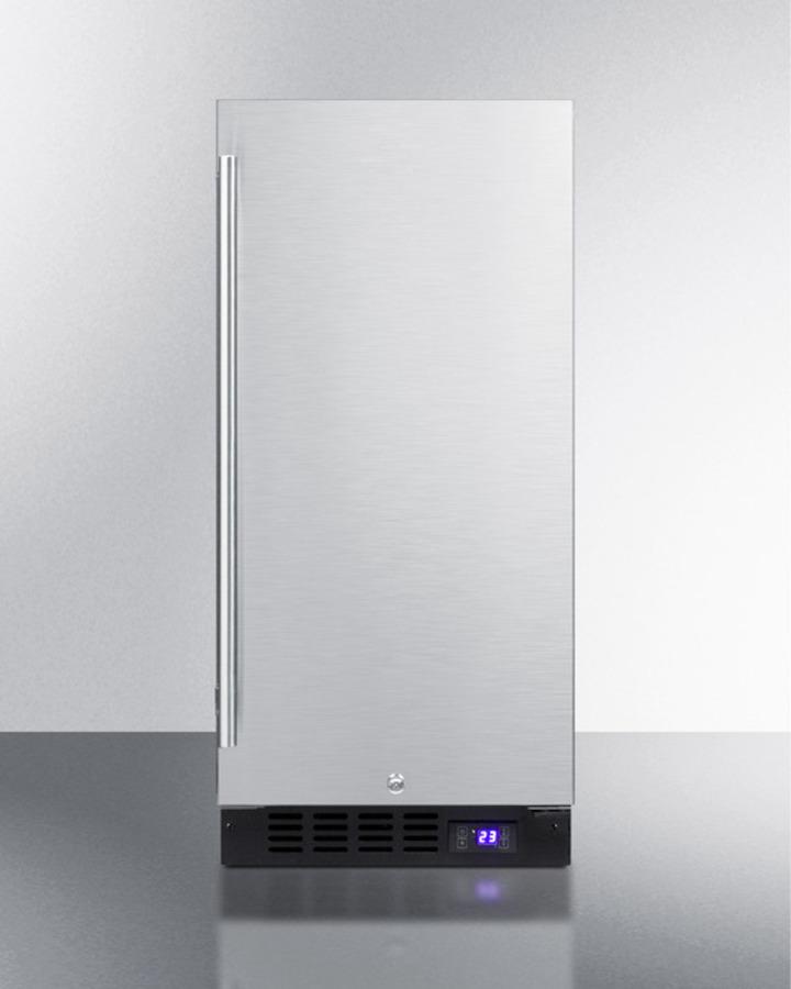 SUMMIT brings true convenience to small kitchen spaces with the SCFF1533BCSS, a 15" wide fully frost-free all-freezer. The SCFF1533BCSS is front-breathing for built-in installation under counters, but can also be used freestanding. The cabinet and door are fully wrapped in stainless steel, with a sleek handle to complete the look. The user-reversible door includes a factory installed lock for added security. Inside, the SCFF1533BCSS is fully frost-free to minimize user maintenance, with slide-out chrome shelves that can be adjusted to accommodate a variety of items. Recessed LED lighting provides an elegant and efficient display inside the 2.4 cu.ft. interior. This unit includes a digital thermostat in the kickplate for easy and intuitive temperature control. With a uniquely slim size and user-friendly features, the SCFF1533BCSS is the ideal freezer for space-challenged homes. This unit can be paired with the matching FF1532BCSS all-refrigerator as a side-by-side set or combined with our Stack15. It is ETL-S listed to NSF-7 commercial standards and meets UL-471.