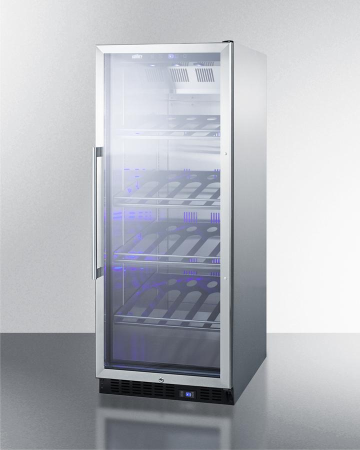 Summit Commercial offers a unique selection of wine cellars designed for optimum storage and bottle presentation. The SCR11561CHCSS is an upright wine cellar built to meet NSF-7 commercial standards. The slim 24 inch footprint takes up minimum floor space, while the large 11 cu.ft. The self-closing stainless steel trimmed door includes a pro style handle and factory-installed lock for added security. This unit has a front-breathing cooling system that allows built-in installation, and a fully finished exterior that also enables freestanding use. It comes with a right hand door swing. Inside, the SC1156CHCSS includes stainless steel shelving specially designed to hold champagne and sparkling wine bottles at a slight angle, providing a full display of the label. The interior walls and floor are constructed from stainless steel for lasting durability in busy commercial settings. This unit is illuminated through the rear walls with efficient LED lighting in a striking blue hue. The digital control panel offers a wide 36 to 68 F temperature range that allows you to program the optimum settings for red, white, or sparkling wine. The SCR1156CHCSS comes with a stainless steel wrapped cabinet. Additional choices are available in stainless steel, as well as alternate sizes. Browse our website to explore our full lineup of commercially approved wine cellars.