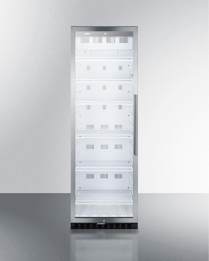 SUMMIT's commercially approved beverage merchandisers are designed for durable service, convenient use, and attractive presentation. SUMMIT SCR1400WLH offers 12.6 cu.ft. of storage space in a slim-fitting footprint just under 24". Bottles and cans can be stored on six heavy duty wire shelves, with fifteen glide options to accommodate different sizes. LED lighting offers full illumination of stored products and a digital thermostat makes temperature control as simple as touching a button. The readout can be viewed in Celsius or Fahrenheit. The frost-free SCR1400WLH features a tempered heat-safe glass door trimmed in stainless steel, with a keyed lock for added security. The stainless steel trimmed glass door includes a pro style handle to complete the modern look, with a self-closing mechanism to ensure items aren't accidentally exposed to warm air. This unit has a front-breathing cooling system that allows built-in installation, and a fully finished exterior that also enables freestanding use. This unit has a left hand door swing. For a right hand version, see the SCR1400W. This model has a white cabinet and a right angle plug for an easier fit. It meets UL-471 commercial standards and is ETL-S listed to NSF standards for use in any commercial foodservice establishment. For this same unit with a stainless steel exterior, see the SCR1400WLHCSS. NOTE: This is an indoor refrigerator and is not designed for use in the outdoors.