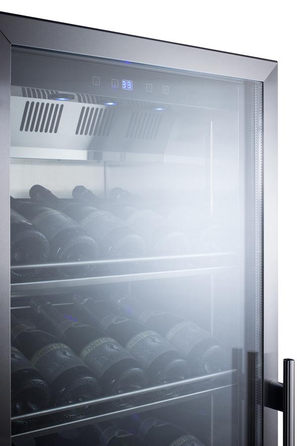Summit Commercial offers a unique selection of wine cellars designed for optimum storage and bottle presentation. The SCR1401LHCHCSS is an upright wine cellar built to meet NSF-7 commercial standards. The slim 24 inch footprint takes up minimum floor space, while the large 12.6 cu.ft. The self-closing stainless steel trimmed door includes a pro style handle and factory-installed lock for added security. This unit has a front-breathing cooling system that allows built-in installation, and a fully finished exterior that also enables freestanding use. It comes with a left hand door swing. For a right hand version, see the SCR1401CHCSS. Inside, the SC1401LHLCHCSS includes stainless steel shelving specially designed to hold champagne and sparkling wine bottles at a slight angle, providing a full display of the label. The interior walls and floor are constructed from stainless steel for lasting durability in busy commercial settings. This unit is illuminated through the rear walls with efficient LED lighting in a striking blue hue. The digital control panel offers a wide 36 to 68 F temperature range that allows you to program the optimum settings for red, white, or sparkling wine. Additional features include an audible high temperature alarm, open door alarm, temperature memory function, and sabbath mode setting. The SCR1401LHCHCSS comes with a fully wrapped stainless steel cabinet. Additional choices are available in stainless steel, as well as alternate sizes. Browse our website to explore our full lineup of commercially approved wine cellars.