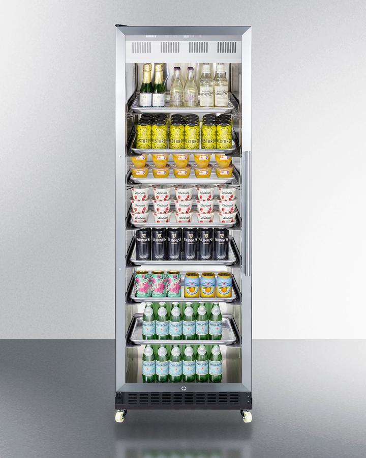 Summit Commercial's line of mini reach-in refrigerators brings versatile convenience to new dining setups, with stainless steel construction for lasting durability and factory-installed dollys to ensure easy portability. The SCR1401LHRI is an upright beverage center conveniently sized with a slim 24-inch footprint. The stainless steel trimmed glass door provides a full view of storage down to the floor, with recessed LED lighting to ensure an attractive and efficient presentation. The door comes in a left-hand door swing and features a self-closing design to help protect stored items in commercial settings where customers may not take the time to ensure a tight seal. This unit comes pre-installed on a dolly with four 3" casters for easy mobility, perfect for restaurants and bars. The dolly can also be removed and reattached as needed. A factory-installed lock offers additional security. This unit has a fully finished black cabinet and is designed for freestanding indoor use. Inside, the SCR1401LHRI utilizes frost-free operation for minimum user maintenance. The interior walls are made from stainless steel for improved durability and sanitation. Its reach-in design allows convenient user access to the interior. The cantilevered shelving system allows users to rearrange the interior to accommodate a variety of sizes. We include a set of U-shaped steel tray holders with seven aluminum half-sheet pans. We also package an additional set of standard chrome shelves for alternate storage if preferred. The digital control panel is conveniently located towards the top, allowing staff to adjust the temperature without bending to the floor. The readout can be viewed in Celsius or Fahrenheit. Additional features include an audible high temperature alarm, open door alarm, temperature memory function, and sabbath mode setting. The SCR1401LHRI is ETL-S listed to NSF-7 for use in commercial settings. Its reach-in design makes it a great choice for bringing flexible, portable, and convenient beverage storage to commercial settings. This unit is also available with a stainless steel cabinet (SCR1401LHRICSS) or with a right-hand door swing (SCR1401RI). Visit our website to see our complete line of reach-in refrigerators.