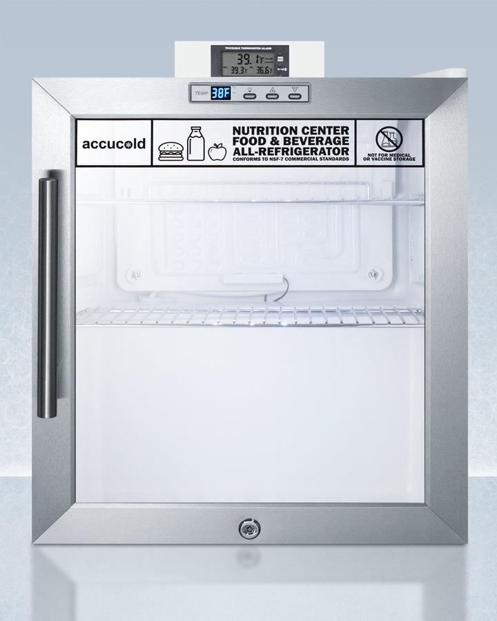 Accucold's Nutrition Center Series features commercially approved refrigerators and freezers specifically designed for the storage of sealed food and beverages in a variety of facilities, including break rooms, waiting areas, nurses' stations, and more. The SCR215LNZ is a compact display refrigerator sized at just 17" wide. It is ETL-S listed to NSF-7 standards for the storage of sealed food and beverages. The top includes a factory installed digital thermometer that provides a continuous external display of the current and minimum/maximum temperature to the nearest tenth of a degree, making it easier for staff to monitor and record the temperature as needed. This device includes a built-in audible alarm that will sound if the unit rises or falls out of the set temperature range. The temperature probe is encased in a glycol-filled bottle to best simulate the temperature of stored contents. All temperature display devices are calibrated to NIST standards in our ISO/IEC 17025:2017 laboratory and include a certificate of calibration. Inside, the SCR215LNZ utilizes low maintenance automatic defrost operation. Adjustable chrome shelves allow users to reconfigure the interior to accommodate a variety of sizes. Recessed LED lighting offers a an energy efficient presentation of the interior and a digital thermostat offers easy temperature management, with a readout viewable in Celsius or Fahrenheit. The SCR215LNZ comes in a white cabinet with a stainless steel trimmed double pane tempered glass door. It includes a pro style handle and a right hand door swing. A factory installed front lock offers convenient security. This unit is designed for freestanding use. Designed specifically for institutional food and beverage storage, all Accucold's Nutrition Centers are commercially approved to NSF standards and comply with most JCAHO recommendations for safe storage. Additional sizes and variations are available.