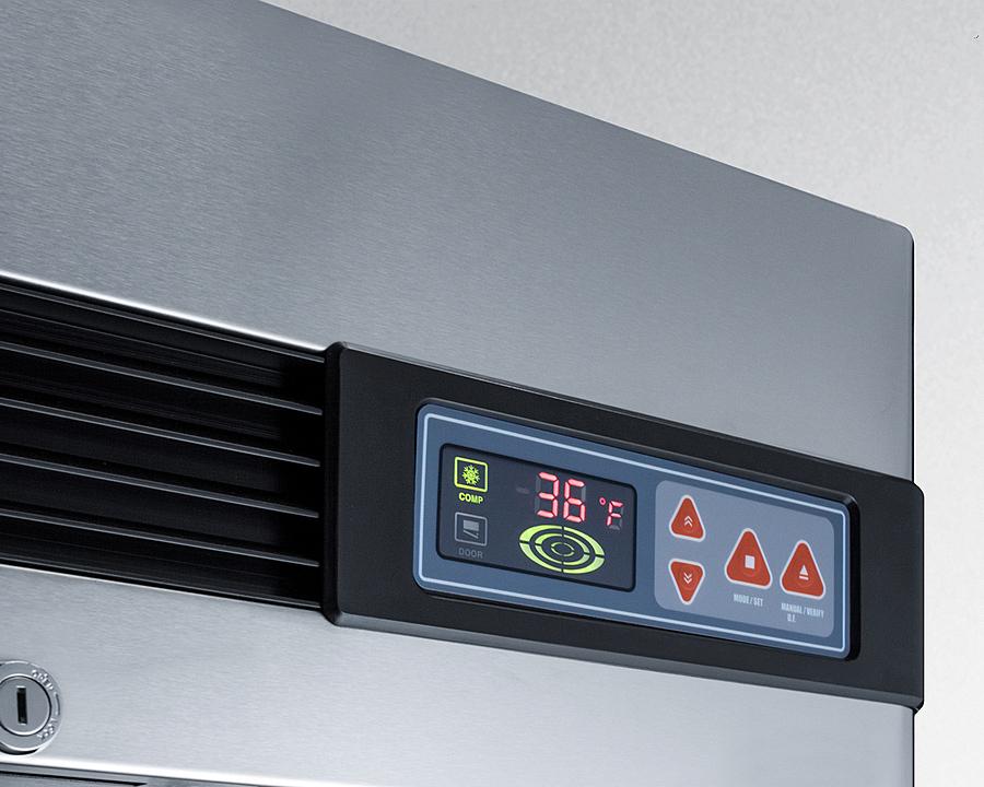 Summit Commercial's line of reach-in refrigeration features durable construction built to NSF-7 commercial standards. Made in South Korea, the SCR23SSGLH is a commercial all-refrigerator with a complete stainless steel cabinet and double pane tempered glass door for a full product display. The door is self-closing design to help protect stored contents in busy commercial settings where customers may not take the time to make sure the door is closed. It will remain open when pushed to 90 , making it easier to load and unload the unit. The sealed back design helps to simplify cleanup. This unit features a factory-installed lock located towards the top of the door for convenient security. We include a set of locking casters for optional installation. The door has a left hand swing. For the same unit with the door opening from the other side, see the SCR23SSG. The SCR23SSGLH features a large 23 cu.ft. interior constructed from stainless steel for easy cleanup and lasting durability. The cantilevered shelving system allows you to adjust the four vinyl-coated shelves to virtually any position, making it easy to accommodate any sized item. This unit is designed to fit common commercial baking trays. The LED lighting offers an energy efficient display when the door is opened. It utilizes adjustable cycle defrost operation to avoid temperature spikes, with a top-mounted forced air cooling system to ensure rapid temperature recovery. To ensure optimum storage conditions, the SCR23SSGLH is equipped with a microprocessor temperature controller that makes it easy for staff to adjust the temperature. The large digital LED readout displays the current and high/low temperatures in Celsius or Fahrenheit. An audible and visual temperature alarm sounds if the unit rises or falls above a user-set rage. Additional alarms include a power failure alert, door open alarm, and a condenser cleaning reminder. Designed with hydrocarbon refrigerant, the SCR23SSGLH provides an energy efficient solution to large capacity storage. It is ETL-S listed to NSF-7 commercial standards. For a matching solid door frost-free freezer, see the SCFF237.