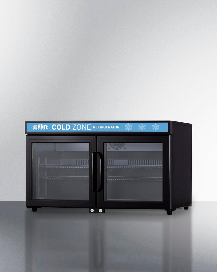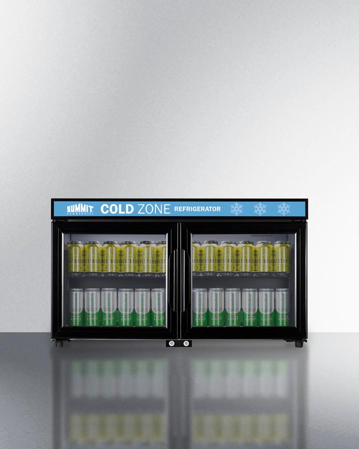 Summit Commercial refrigerators are designed for convenient use in an attractive presentation to increase impulse purchases. The SCR3502DLL is a 17.5" shallow depth single-zone beverage refrigerator with a 36" width, making it ideal for countertops and use on or in shelves (with proper ventilation). It is SGS-listed to NSF-7 standards for use in commercial settings and is designed for freestanding use. Its French door swing with two glass doors offers a full view inside the 3.2 cu.ft. interior, while pre-installed curved, sturdy black handles make for easy opening of the unit. Both doors have a self-closing feature to help protect stored items in commercial settings where customers may not take the time to ensure a tight seal. Factory-installed locks offer additional security. The fully-finished black cabinet suits any setting, with a sealed back for easier cleaning. Four leveling legs keep the unit level on uneven surfaces. Inside, the SCR3502DLL utilizes automatic defrost operation for minimal user maintenance. LED lighting illuminates the interior, while the front LED panel affords the ability for users to insert their own decal for a truly customizable look. Four black wire shelves accommodate a variety of storage options, including condiments, cans, and other refrigerated items. Additionally,the shelves can be removed to store bottles or larger food and beverage items. Each shelf has a front lip to ensure products are secure when the door is opened and closed. Digital controls located on the inside offer easy temperature management with a readout in Celsius. For added peace of mind, an audible high/low temperature alarm sounds if the temperature in the unit goes out of the recommended range. With its compact dimensions and customizable features, the SCR3502DLL is perfect for back bars, retail and convenience stores, supermarkets, and similar commercial environments seeking dependable refrigeration storage in a versatile design that fits in virtually any small space.