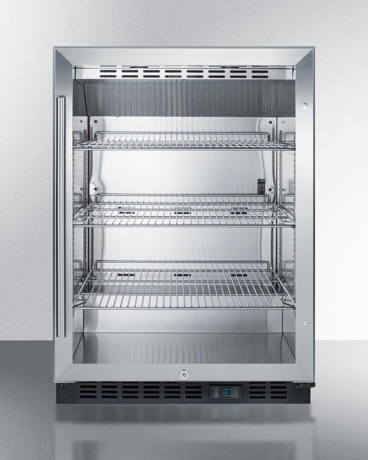 SUMMIT's commercial beverage centers offer an attractive display for products under reliable cold storage conditions. The SCR610BL comes in an easy-fitting 24" footprint, with a front-breathing design that can be built-in under counters or used freestanding. The reversible double pane tempered glass door includes a professional handle and a factory installed lock, with stainless steel door trim to help highlight stored products. A digital thermostat is located in the kickplate for easy temperature management. Inside, the SCR610BL utilizes low maintenance automatic defrost operation with an internal fan to ensure even temperature distribution. Recessed LED lighting offers the perfect display conditions inside the durable and easy-to-clean stainless steel interior. This unit includes three cantilevered chrome shelves to ensure flexible storage that accommodates any item size. High temperature and open door alarms offer added protection. The SCR610BL is ETL-S listed to NSF-7 for use in commercial settings and is ENERGY STAR certified as a commercial refrigerator. For a matching frost-free glass door freezer, see model SCF475.