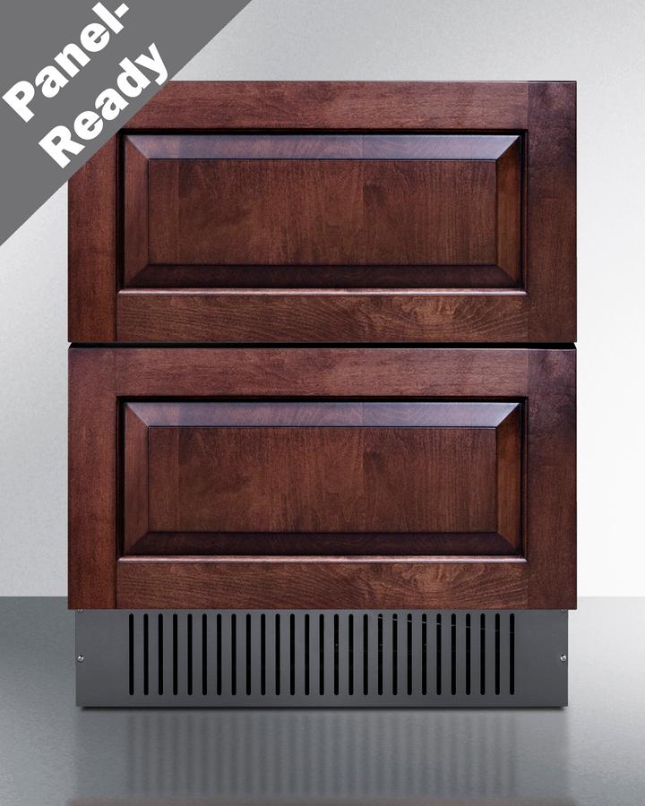 Summit is expanding its popular lineup of built-in undercounter refrigeration with new luxury choices for 27" wide spaces in residential or commercial kitchen indoor and outdoor spaces. Model SPR275OS2DPNR is a panel-ready 2-drawer all-refrigerator sized just under 27" wide and under 24" deep for an easy fit under the counter in any kitchen with limited depth. The drawer fronts are designed to accept overlay panels (sized at 26.77" W x 13.78" H at a 3/4" thickness) to allow you to create a custom look that best suits your kitchen design. We include a set of handles for optional use, and the drawer fronts are fully finished in stainless steel if you prefer that style. The front-breathing design allows built-in installation, while the fully finished black cabinet also enables freestanding use. The sealed back and right angle plug help to ensure an easy fit. With nearly 5 cu.ft. of interior capacity, the SPR275OS2DPNR is perfect for keeping a variety of items in easy reach. Each drawer includes a removable divider that lets you create four adjustable sections inside to help organize the interior. The intuitive digital control panel features a wide range from 34 to 65 F, allowing you to adjust your storage conditions for standard food items or beverages better held at warmer temperature. The temperature display can be switched from Fahrenheit to Celsius for added convenience. Both drawers feature LED lighting in a striking blue finish for elegant illumination. Frost-free operation minimizes maintenance and internal fans help to maintain an evenly cooled interior. Additional features include open drawer alarms, a child lock to prevent changes to the controls, an eco mode setting, and a 96 hour sabbath mode to disable certain features for periods of observance. The SPR275OS2DPNR features weatherproof construction for safe installation in outdoor kitchens. It is ETL-S listed to NSF-7 commercial standards and also complies with residential regulations for home use. In addition to this refrigerator, we also manufacture the same style in a 30" fit, as well as 32" high versions of both models for installation under lower ADA compliant counters. Browse Summit's extensive selection of built-in undercounter refrigeration to discover the perfect fit for virtually any kitchen space.