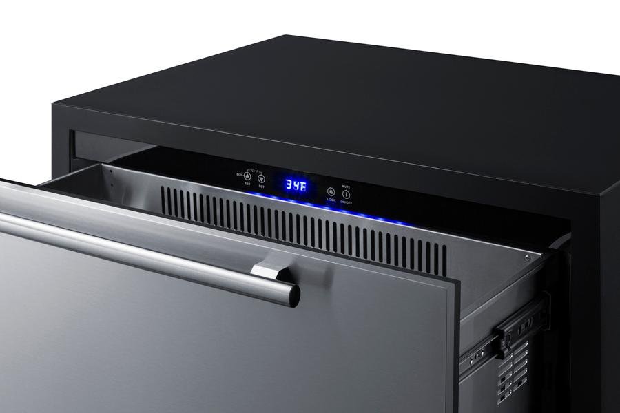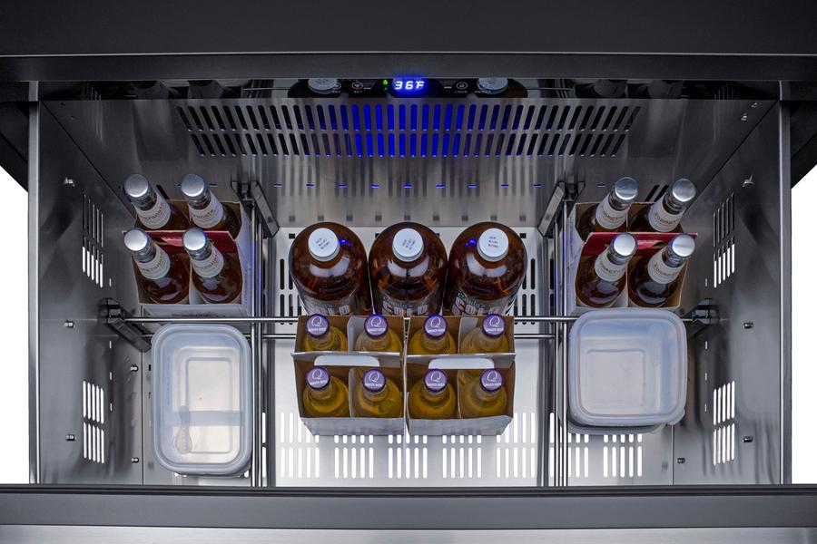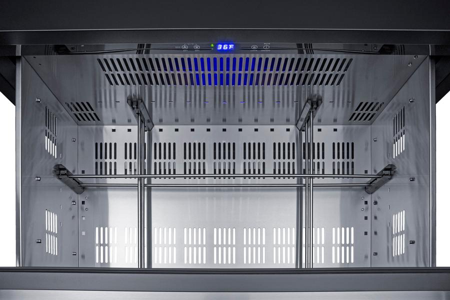 Summit is expanding its popular lineup of built-in undercounter drawer refrigeration with a new luxury 36" wide unit for residential or commercial kitchen spaces. The SPR36332D is a 2-drawer all-refrigerator sized just under 36" wide and 24" deep for an easy fit under the counter in indoor or outdoor kitchens. Stainless steel drawers paired with professional stainless steel handles ensures lasting durability and a stunning, contemporary style to suit any setting. The fully finished drawer fronts can also be removed to accept full overlay panels for a custom look to match any kitchen style. This unit has a front-breathing design for built-in installation, with a fully finished cabinet to also allow freestanding use. The unit's sealed back and right-angle plug help to ensure an easy fit. With a generous 7.15 cu.ft. interior capacity, the SPR36332D is perfect for keeping various items in easy reach. Each drawer includes a set of removable divider that lets you create six adjustable sections inside to help organize the interior. The intuitive digital control panel features a wide temperature range, allowing you to adjust your storage conditions for standard food items or beverages better held at warmer temperatures. The temperature display can be switched from Fahrenheit to Celsius for added convenience. The SPR36332D operates with a frost-free system, which minimizes the need for manual defrosting and reduces maintenance. Internal fans help to maintain an evenly cooled interior, ensuring that your items are kept at the desired temperature. Additional features include open drawer alarms, a child lock to prevent changes to the controls, an eco mode setting, and a 96 hour sabbath mode to disable certain features for periods of observance. Both drawers feature LED lighting in a striking blue finish for elegant illumination. The SPR36332D features weatherproof construction for safe installation in outdoor kitchens. It is ETL-S listed to NSF-7 commercial standards and also complies with residential regulations for home use. In addition to our 36" wide choice, Summit manufactures a wide selection of built-in undercounter and ADA-height drawer refrigeration starting at just 15" wide. Browse Summit's extensive selection of built-in undercounter refrigeration to discover the perfect fit for virtually any kitchen space.