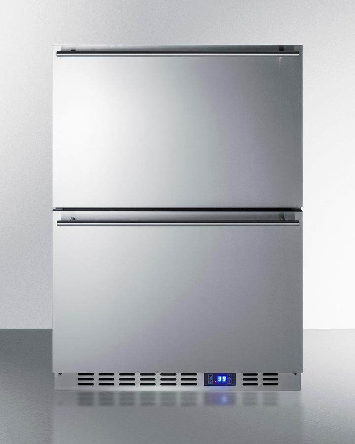 SUMMIT's outdoor collection of stainless steel drawer refrigerators brings luxury style, quality construction, and user convenience to any outdoor kitchen. Sized with a convenient 24" footprint, the SPR627OS2D can be built-in under counters or used freestanding. The cabinet and drawers are constructed from weatherproof stainless steel, with sleek handles to complete the look. An integrated Ground Fault Circuit Interrupter helps to protect the unit in the event of circuit breaks and the sealed back adds extra protection from the elements. We include an anti-tip bracket (installed by the user) for added safety. Two sliding drawers offer convenient storage inside the 3.4 cu.ft. auto defrost interior, with fan-forced cooling to ensure even temperature distribution. The drawers are fully constructed from stainless steel for easy cleaning and long-lasting use. Inside, a full-width sliding wire basket offers easy storage, while two adjustable dividers let you organize both the top and bottom drawer by separating the interior to accommodate a variety of items. Recessed LED lighting offers an attractive yet energy efficient look inside. The digital thermostat located in the stainless steel kickplate offers a readout in Celsius or Fahrenheit. Additional features include a Sabbath mode setting, temperature memory function, and audible alarms for high temperature fluctuations and open drawer alerts. The SPR627OS2D can be used in home or commercial settings. This unit is ETL-S listed to NSF-7 standards and meets UL Commercial Standard 471. For a matching frost-free freezer, see the SPFF51OS2D.