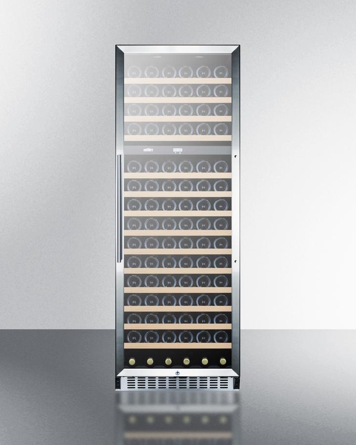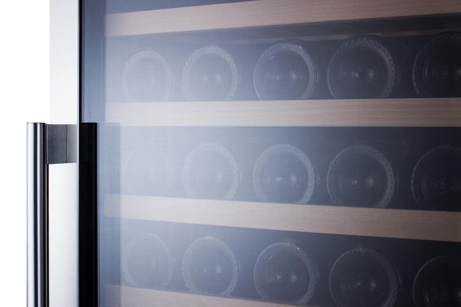 SUMMIT SWC1966CSS is a full-sized dual zone wine cellar designed for optimum wine storage with user-friendly convenience. Sized at just under 24" wide and 27" deep, the SWC1966CSS can store up to 160 standard 750ml Bordeaux bottles on slide-out wooden shelves. Alternatively, this unit can hold up to 118 larger Burgundy style bottles (often used for Chardonnay or Pinot Noir) or a combination of 22 champagne bottles and 132 Bordeaux style. Two digital thermostats let you manage the temperature zones with ease and include an LED temperature display that can be shown in Celsius or Fahrenheit. The larger lower compartment is best suited for red wines stored between 55 and 72 F, while the upper zone is designed for white wine and champagne stored between 41 and 55 F. Recessed LED lighting offers an attractive touch. Additional features include a Sabbath mode setting, open door alarm, temperature memory function in case of power loss, and high temperature alarm for added protection. The SWC1966CSS features a stainless steel wrapped cabinet cabinet and reversible stainless steel trimmed glass door that offers a full display of the interior. A sleek stainless steel handle completes the look, and a factory installed lock offers added security. This unit can be used freestanding or built-in with extra rear clearance. See the user manual for more information. With its ideal size and handy features, the SWC1966CSS is an elegant yet affordable wine cellar for full storage needs.