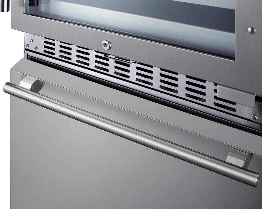 Summit brings an innovative, elegant solution to store wine, food, and beverages with its combination two-zone wine cellar and two-drawer refrigerator - the perfect entertainment station for the home. Sized at just under 24" wide, the SWCDAR24 combines the 46 bottle capacity two-zone wine cellar (model ALWC532) with the 3.4 cu.ft. two-drawer refrigerator (model FF642D) into one complete refrigeration station. The front-breathing design allows built-in installation, while the stainless steel cabinet affords freestanding use in a durable design. Pro-style handles in brushed stainless steel complete the modern look, while the sealed back offers added space savings when placing the unit. The included 6' Y-shaped NEMA 5-15P cord with a 3-prong right angle plug allows users to operate both units from one outlet without added depth. For user convenience, this model ships fully assembled. The upper two-zone wine cellar has a user-reversible double-pane tempered glass door featuring a seamless stainless steel door for a modern look, while a factory-installed lock offers security as needed. Inside, automatic defrost operation ensures minimal user maintenance. It is designed to store up to 46 standard Bordeaux style bottles, or a combination of 30 Bordeaux and 16 wider Burgundy bottles. The digital control panel allows you to manage the upper-temperature zone between 41(degree)F and 50 F for white wine, while the lower zone is designed to store red wine between 50(degree)F and 64 F. Six full-extension black wire shelves with stainless steel front trim move out smoothly on ball-bearing glides for convenient loading. Both zones include recessed LED lighting in a gentle blue hue for an attractive and efficient presentation. The bottom two-drawer refrigerator features complete stainless steel construction inside and out for long-lasting durability in an easy-to-clean design. The digital thermostat makes it simple to manage the interior temperature. An internal fan ensures both drawers are evenly cooled. Two adjustable dividers allow you to separate the drawer compartments into two or four zones to accommodate a variety of sizes, perfect for storing canned beverages or meats and cheeses to pair with your favorite wine. A sliding chrome basket offers additional storage convenience as needed, while the LED lighting makes it easy to view interior contents when loading or unloading both drawers. Additional features include a high-temperature alarm and an open drawer alarm for added peace of mind. Sabbath Mode disables certain electrical features during periods of religious observance, while a temperature memory function helps to recover all settings in the event of power loss. Offering complete refrigeration convenience in a slim-fitting design, the SWCDAR24 is ideal for home bars, kitchens, and similar residential settings seeking to store wine, beverages, and food in a modern style. This unit can also be ordered to accept custom panels over the drawers and door frame (see model SWCDAR24PNR). Additional options are available with a bottom freezer (model SWCDAF24) or a bottom refrigerator-freezer (model SWCDRF24). Note: This unit comes with an anti-tip bracket which should be installed to prevent tipping forward.