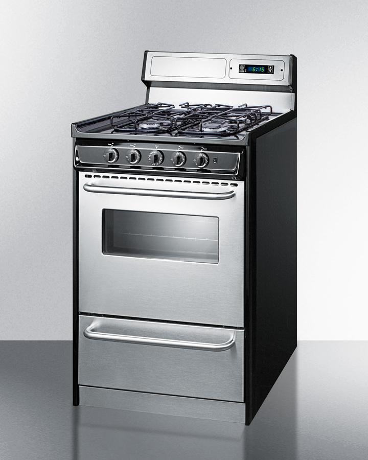 SUMMIT PROFESSIONAL brings luxury and convenience to smaller kitchen spaces with a quality line of slim-fitting ranges made in the U.S.A. The TTM13027BKSW is a 20" wide gas range ideal for use inside apartments and other settings with space-challenged kitchens. The stainless steel exterior offers lasting durability and modern style, with professional towel bar handles on the oven and lower broiler compartment to complete the look. The oven includes a window and interior light to make it easy to monitor your cooking. The deluxe backguard features a digital clock and timer for added convenience. Four sealed gas burners offer safer and cleaner cooking. Constructed from steel and porcelain, Summit's American-made cooking line offers long-lasting quality for the home. Additional choices are available in 24" and 30" wide fits.
