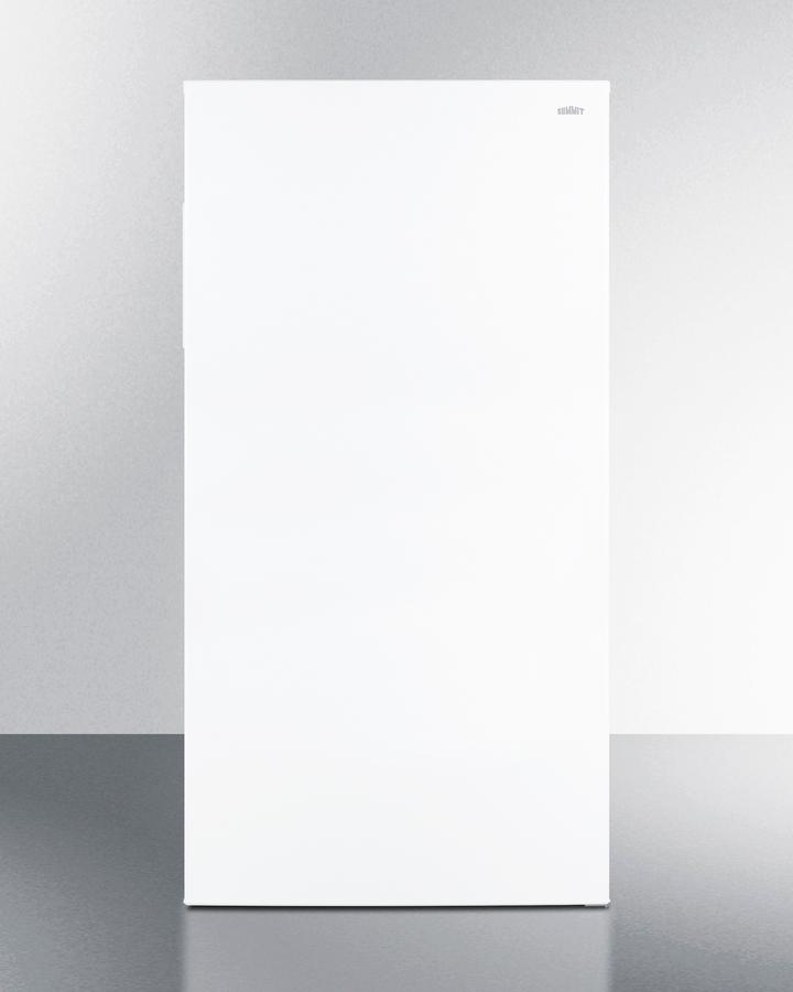 Summit's selection of full-sized units offers generous storage capacity for a variety of cold storage applications, with frost-free upright all-freezers to ensure low maintenance use in busy facilities. Made in North America, model UF19W is an upright all-freezer with a 17.9 cu.ft. storage capacity. It comes in a white exterior finish with a textured cabinet and user-reversible door swing. This unit has a sealed back for easier cleanup and a right angle cord to allow a better fit. A simple touch control thermostat is located inside for easy use. The UF19W utilizes frost-free operation, eliminating the need to manually defrost the interior. Adjustable wire shelves accommodate a variety of sizes, with clear twin crispers located at the bottom. Three removable door racks are also included. This unit features LED lighting for an efficient view. With its low maintenance design and large storage capacity, the UF19W is the ideal storage solution for any home or break room in need of a reliable freezer for extra storage of frozen goods.